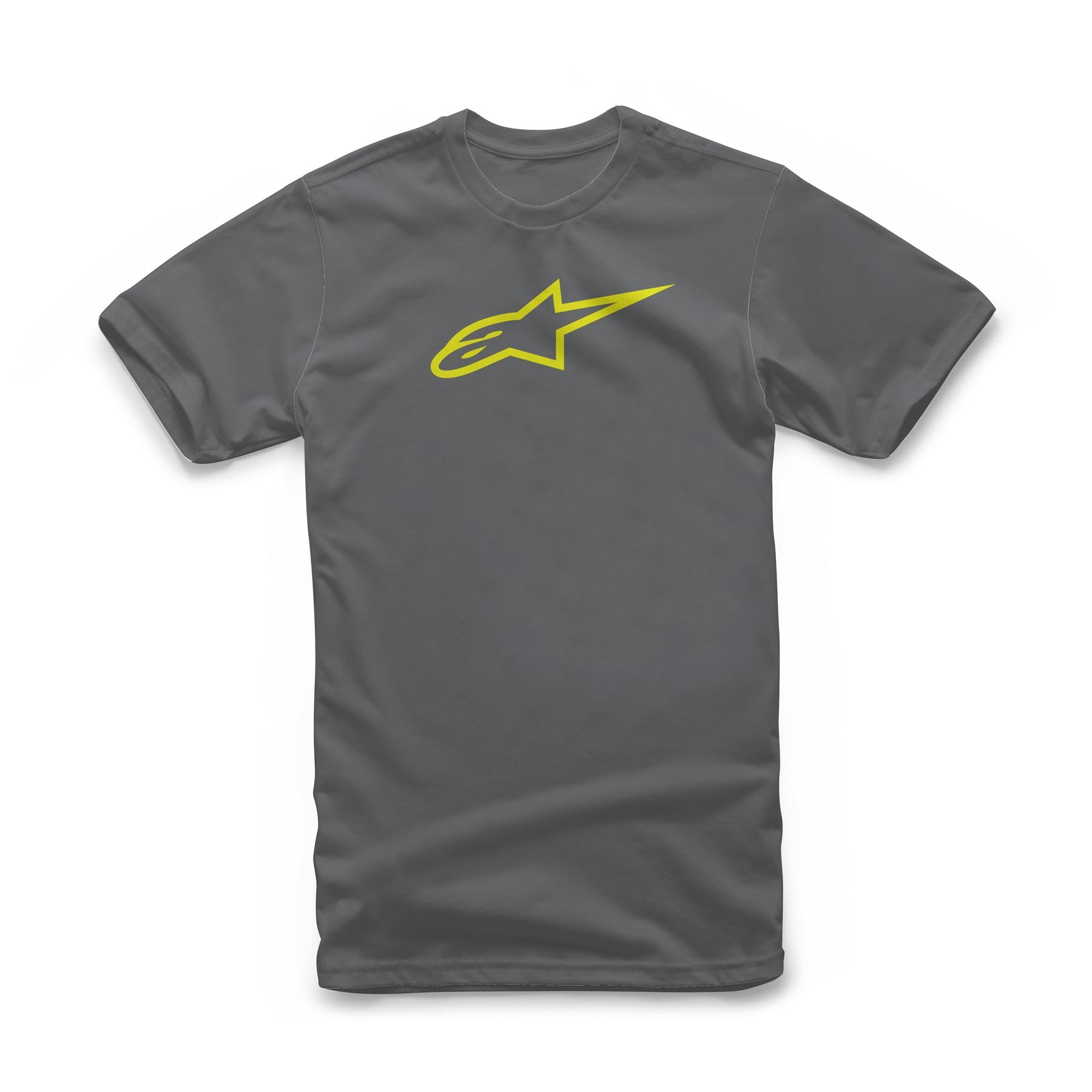 Alpinestars Ageless Astars logo on front. Soft hand print internal neck print. External Alpinestars labelling. Classic fit. Colour is Charcoal and Vis Yellow
