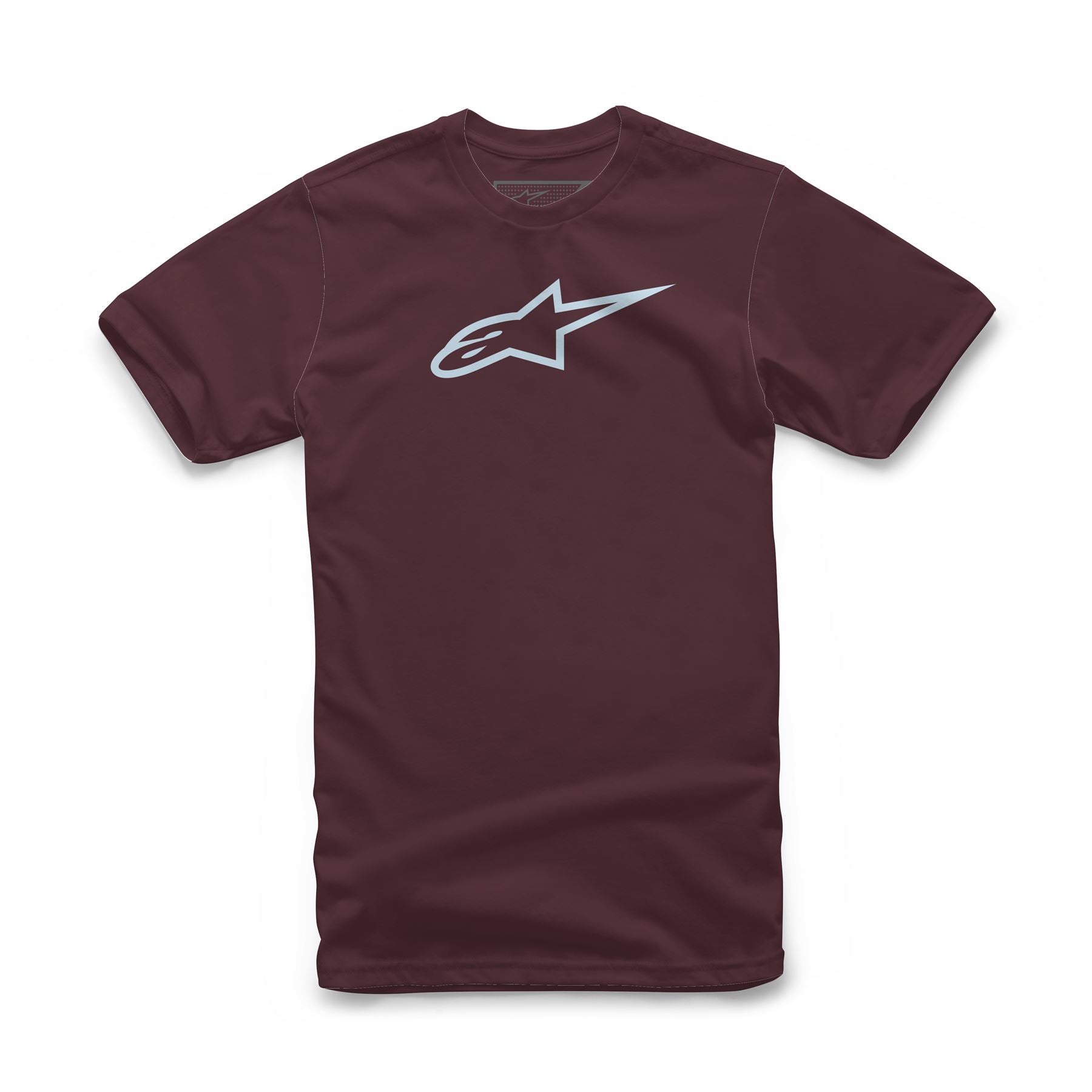 Alpinestars Ageless Astars logo on front. Soft hand print internal neck print. External Alpinestars labelling. Classic fit. Colour is Maroon and Mist
