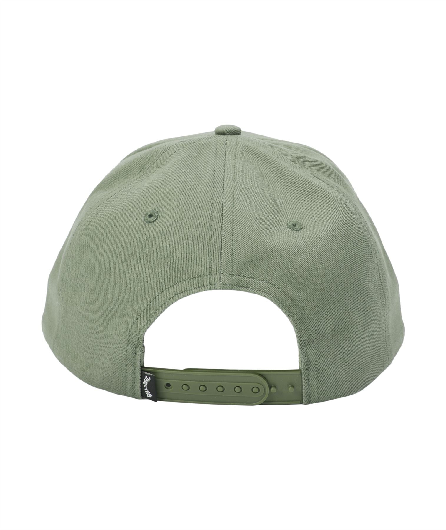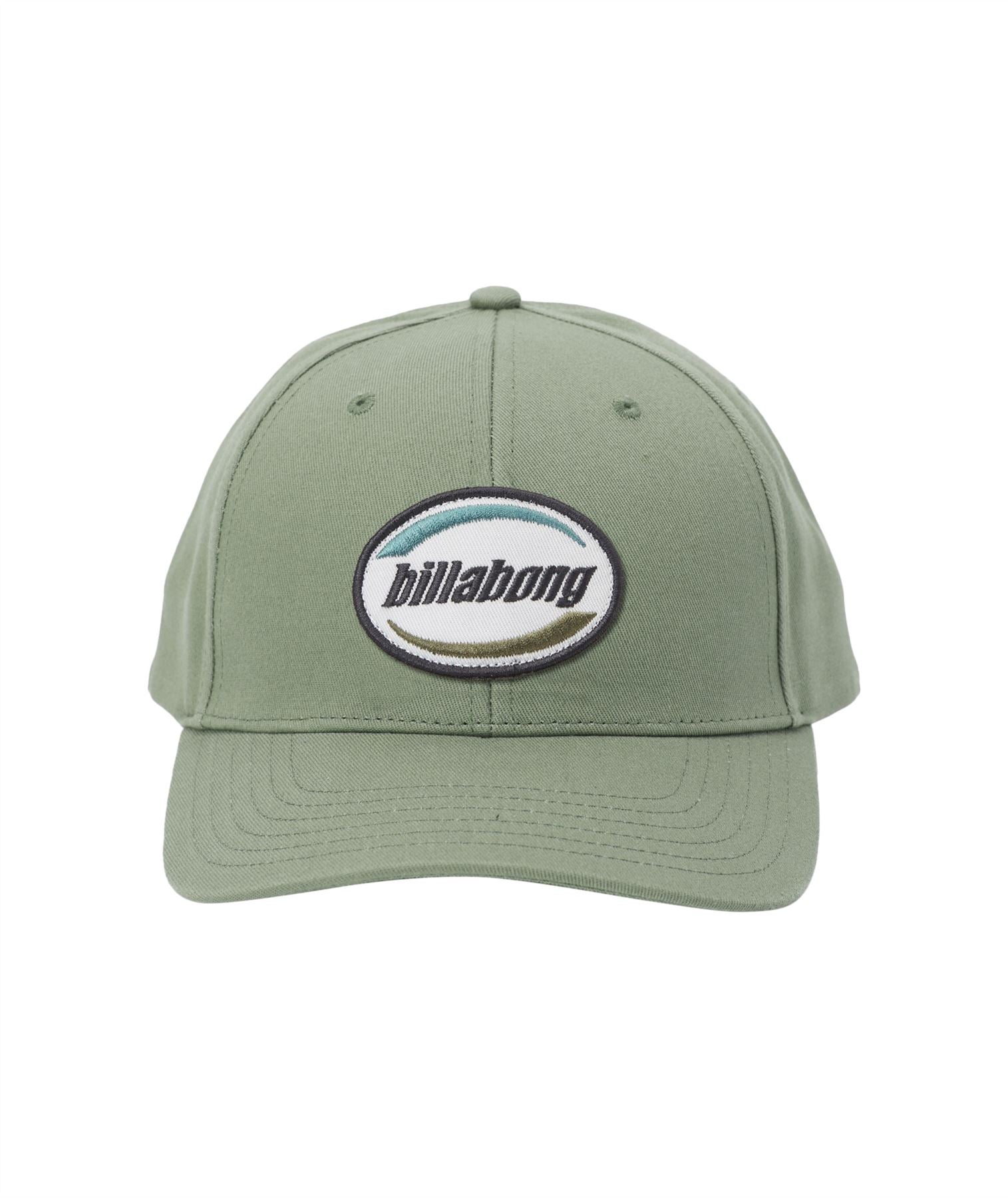 Embroidered Billabong patch label on front. Vertical Billabong flag logo label on back. Demi curved bill. Snapback rear fastener. 100% Coptton fabric. Colour sage