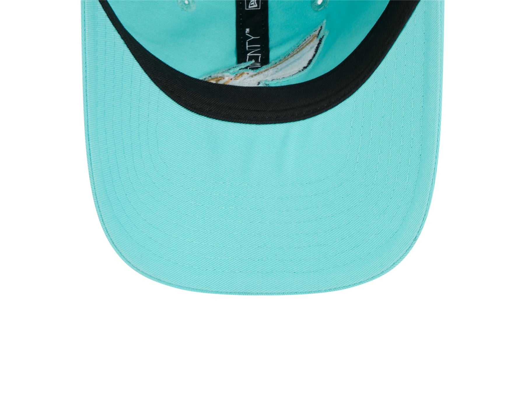 Charlotte Hornets NBA24 9Twenty Adjustable New Era Cap. Embroidered Charlotte Hornets logo on front. Embroidered New Era flag on left. 6 panel unstructured crown which can be folded into a bag. Curved visor with rear strapback fastener. NBA patch logo on rear fastener. Light blue Cap with light blue undervisor.