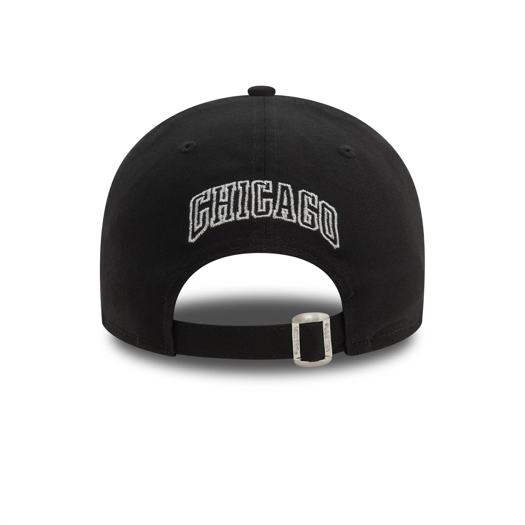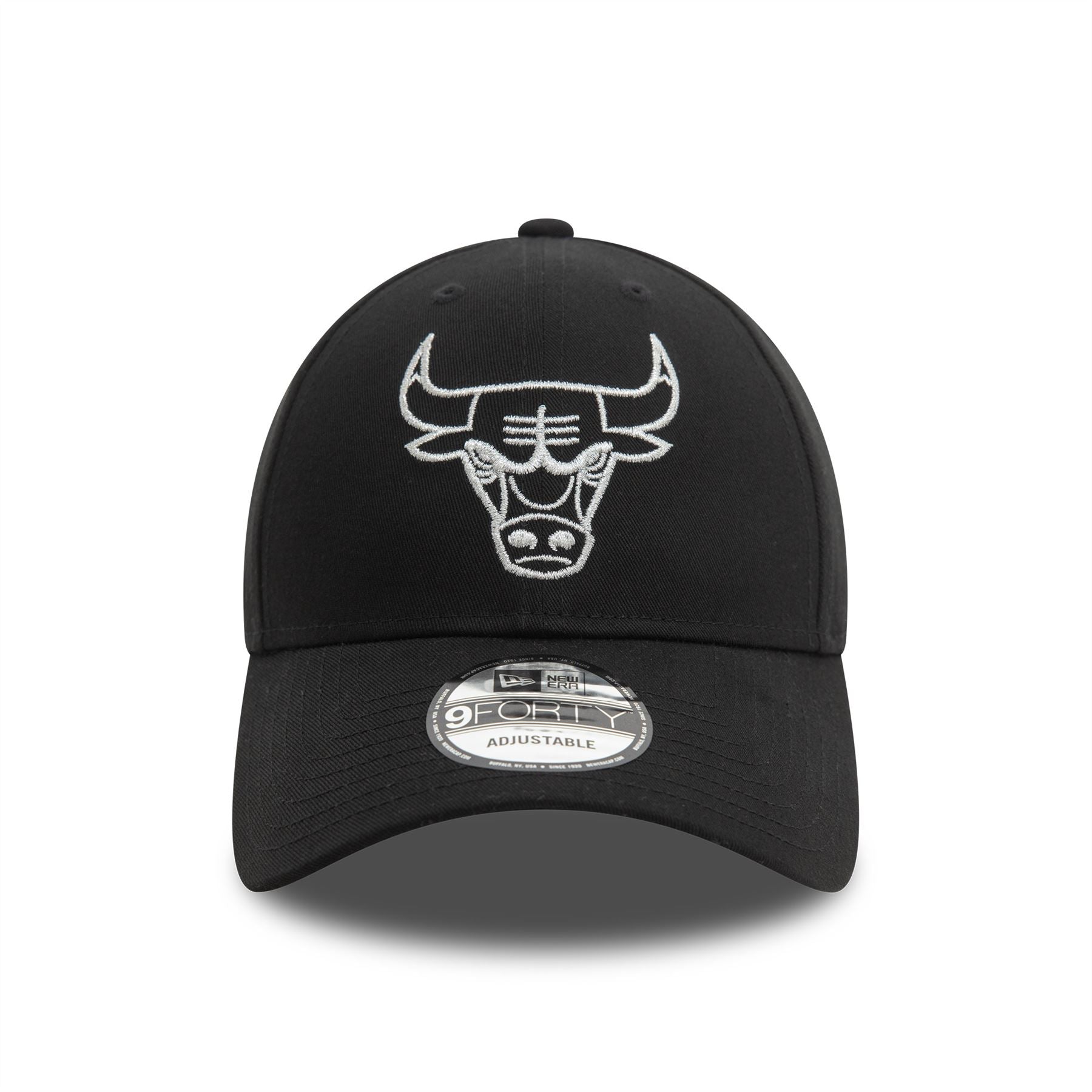 Metallic Outline Chicago Bulls 9FORTY Cap. Embroidered Chicago Bulls logo on front. Chicago wordmark on rear arch. Embroidered New Era flag on left. 6 panel structured crown. Curved visor with rear strapback fastener. Black Cap with black undervisor.