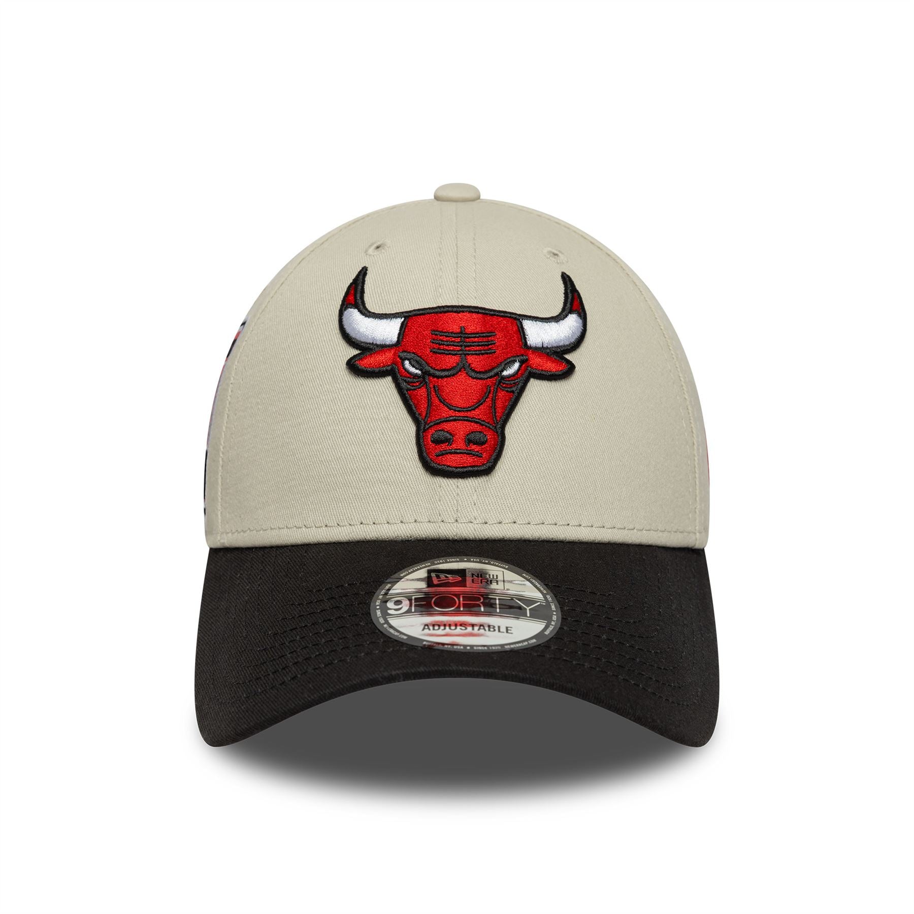 Embroidered Chicago Bulls logo on front. Embroidered Chicago Bulls sidepatch on right. Embroidered New Era flag on left. 6 panel structured crown. Curved visor with rear strapback fastener. Cream Cap with black undervisor.