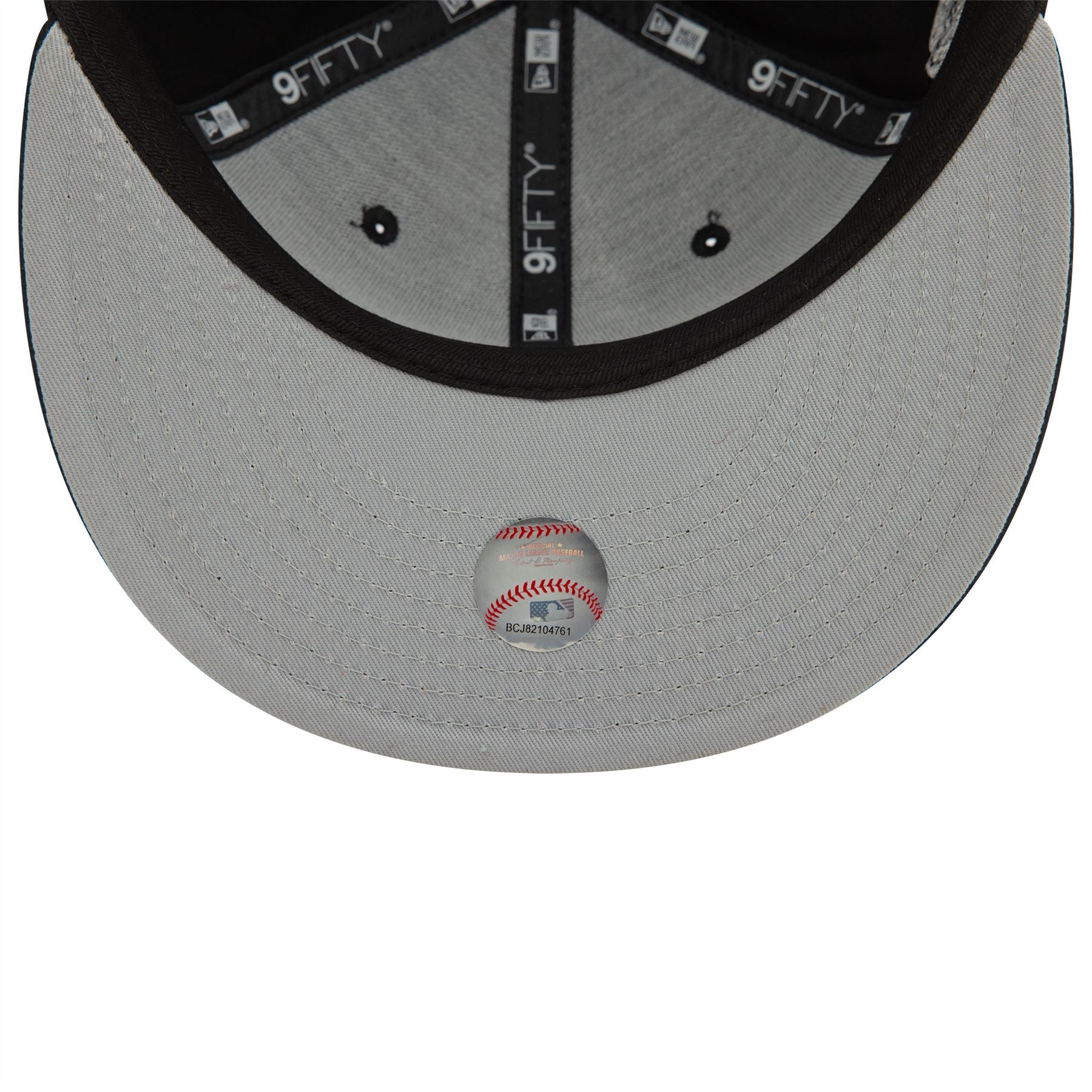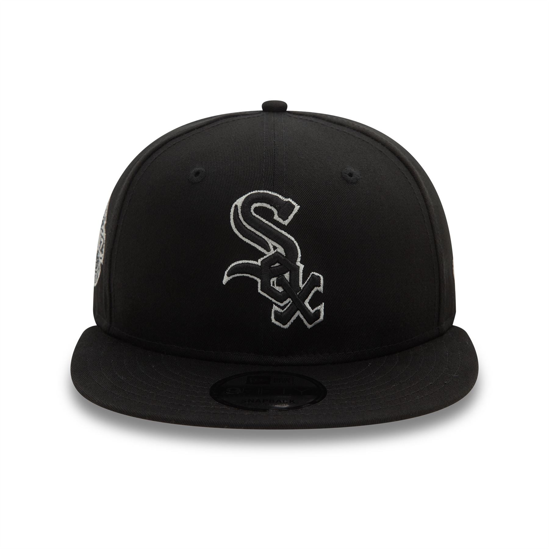 Chicago White Sox Seasonal World Series Black 9FIFTY Snapback Cap. Embroidered Chicago White Sox logo on front. Chicago White Sox World Series sidepatch on right. Embroidered New Era flag on left. 6 panel structured crown. Flat visor with rear snapback fastener. Black Cap with grey undervisor.