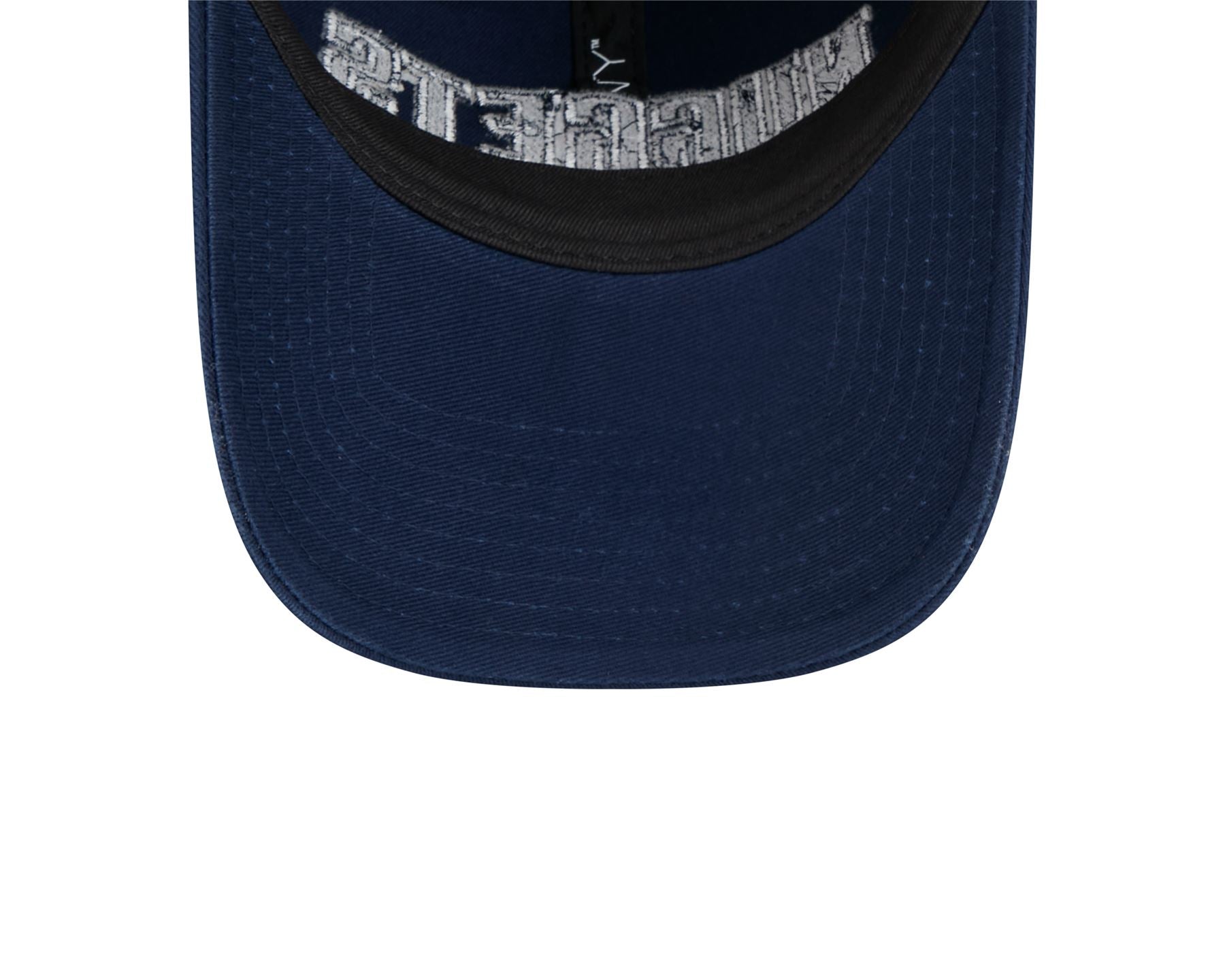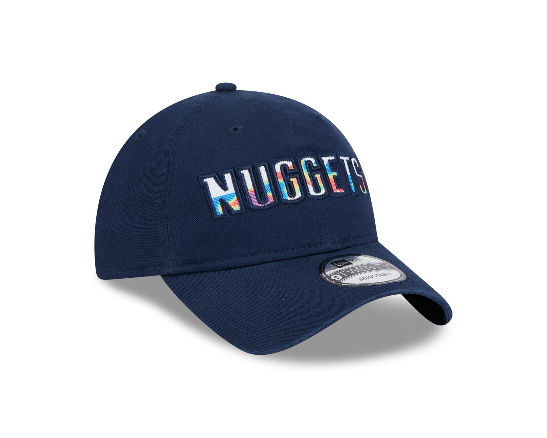 Denver Nuggets NBA24 9Twenty Adjustable New Era Cap. Embroidered Denver Nuggets logo on front. Embroidered New Era flag on left. 6 panel unstructured crown which can be folded into a bag. Curved visor with rear strapback fastener. NBA patch logo on rear fastener. Blue Cap with blue undervisor.
