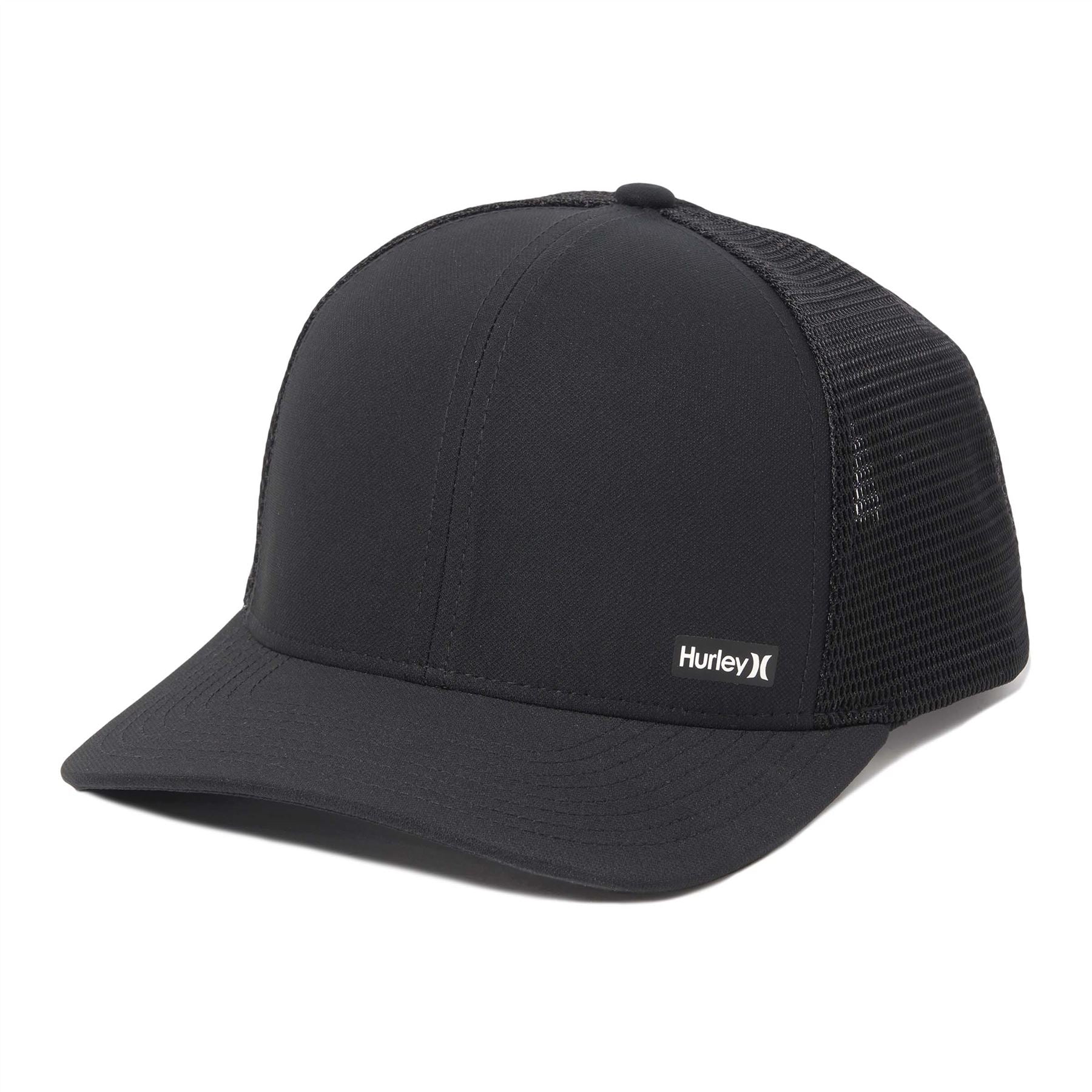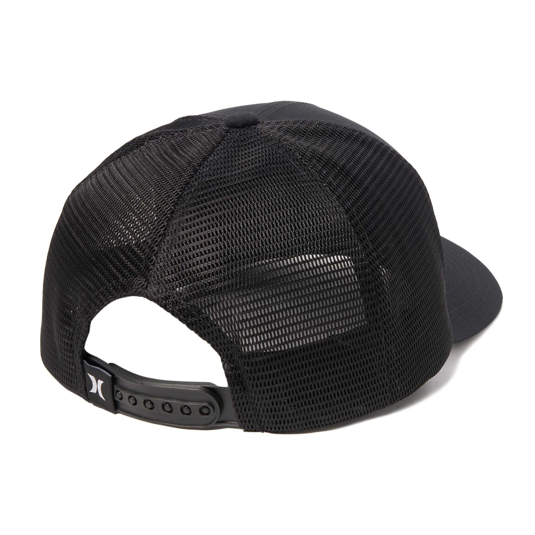 Hurley name and logo on front. Woven Hurley tab label on adjuster. 6 panel structured crown. Black mesh back and side panels. Curved visor with rear snapback fastener. Black Cap with black undervisor.