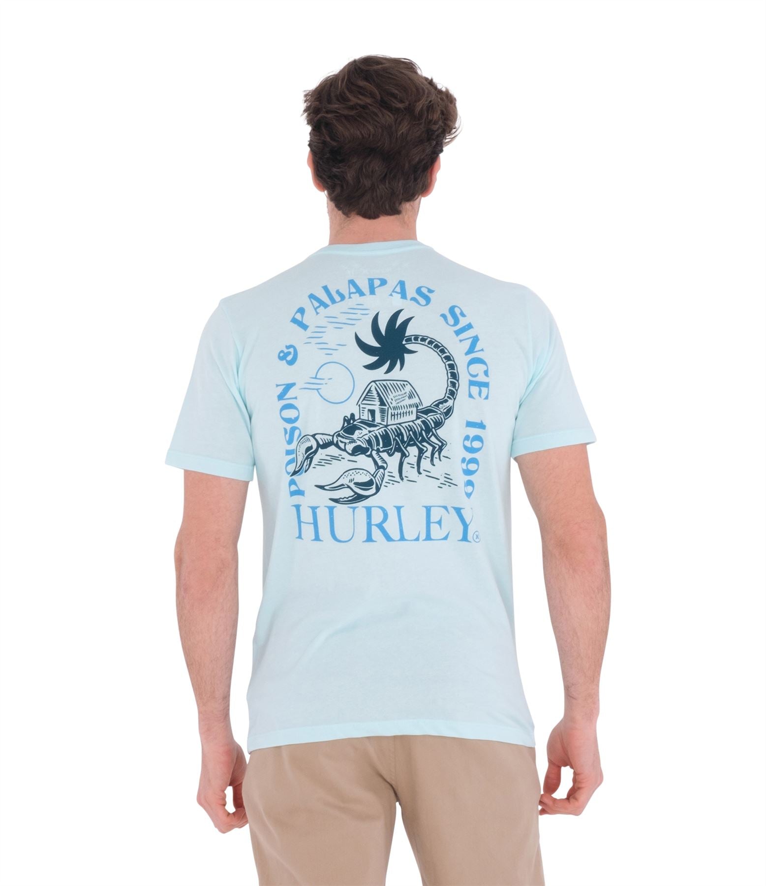 Short sleeved t-shirt. Crew neck. Front and Rear Hurley logo and design. Garment washed. Cotton jersey fabric. Classic comfortable standard fit. Colour blue