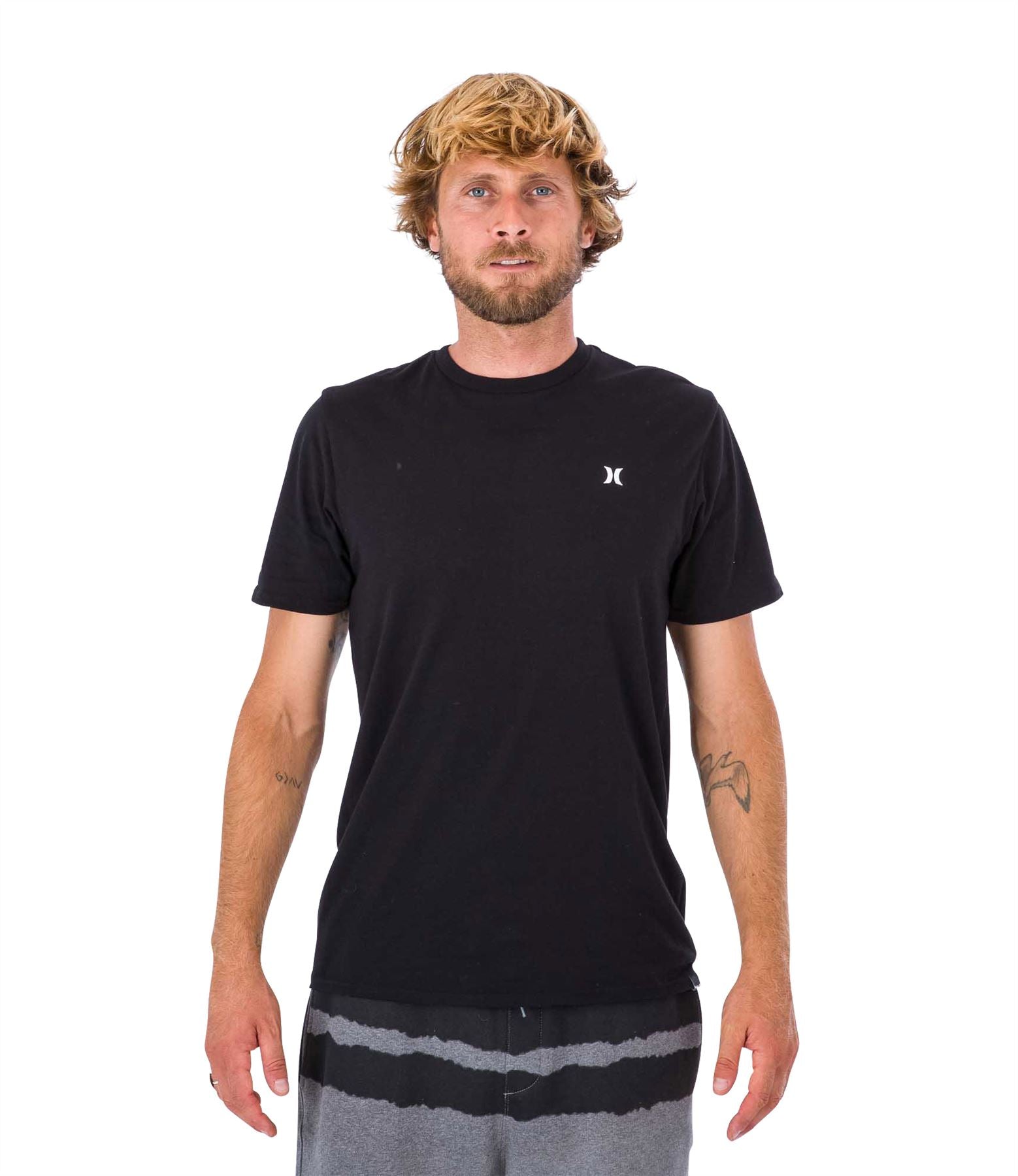 Men's short sleeve tee. H2O-Dri fabric wicks fabric to help keep you dry. Relaxed Fit. Round collar. Pinted Hurley One & Only logo on front. Side seam construction. Custom back neck artwork. One and Only woven label. Colour black.