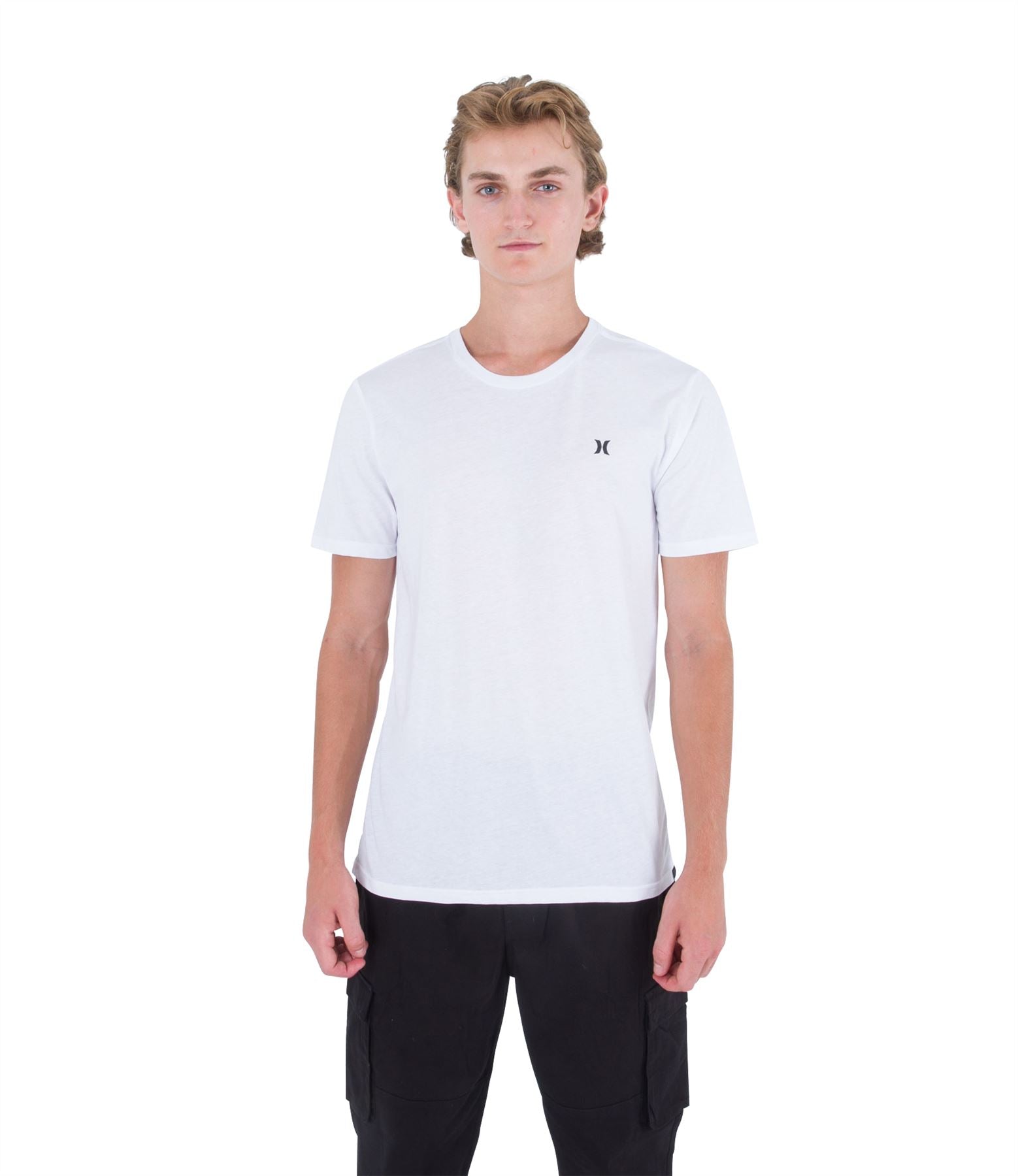 Men's short sleeve tee. H2O-Dri fabric wicks fabric to help keep you dry. Relaxed Fit. Round collar. Pinted Hurley One & Only logo on front. Side seam construction. Custom back neck artwork. One and Only woven label. Colour white.