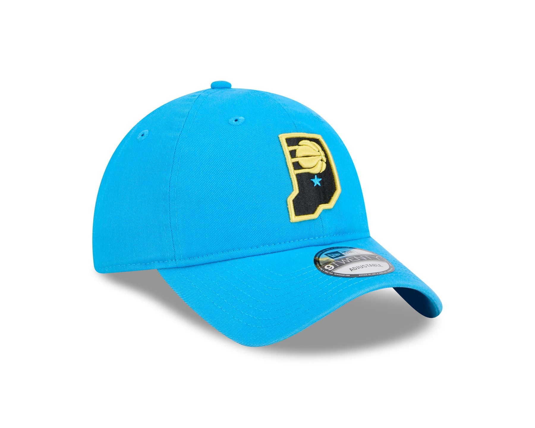 Indiana Pacers NBA24 9Twenty Adjustable New Era Cap. Embroidered Indiana Pacers logo on front. Embroidered New Era flag on left. 6 panel unstructured crown which can be folded into a bag. Curved visor with rear strapback fastener. NBA patch logo on rear fastener. Blue Cap with blue undervisor.