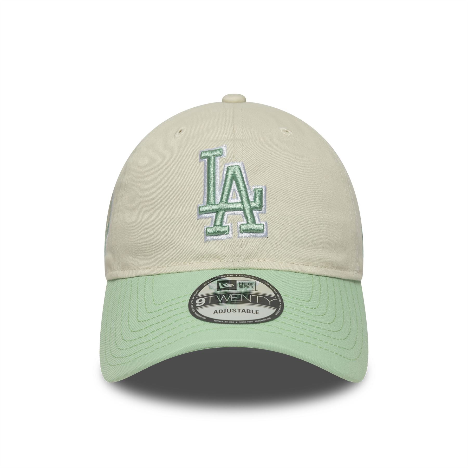 Embroidered LA Dodgers logo on front. Embroidered LA Dodgers Cooperstown World Series sidepatch on right. Embroidered New Era flag on left. 6 panel unstructured crown that allows tha cap to be put in a bag. Curved visor with rear strapback fastener. Cream Cap with pastel green undervisor.