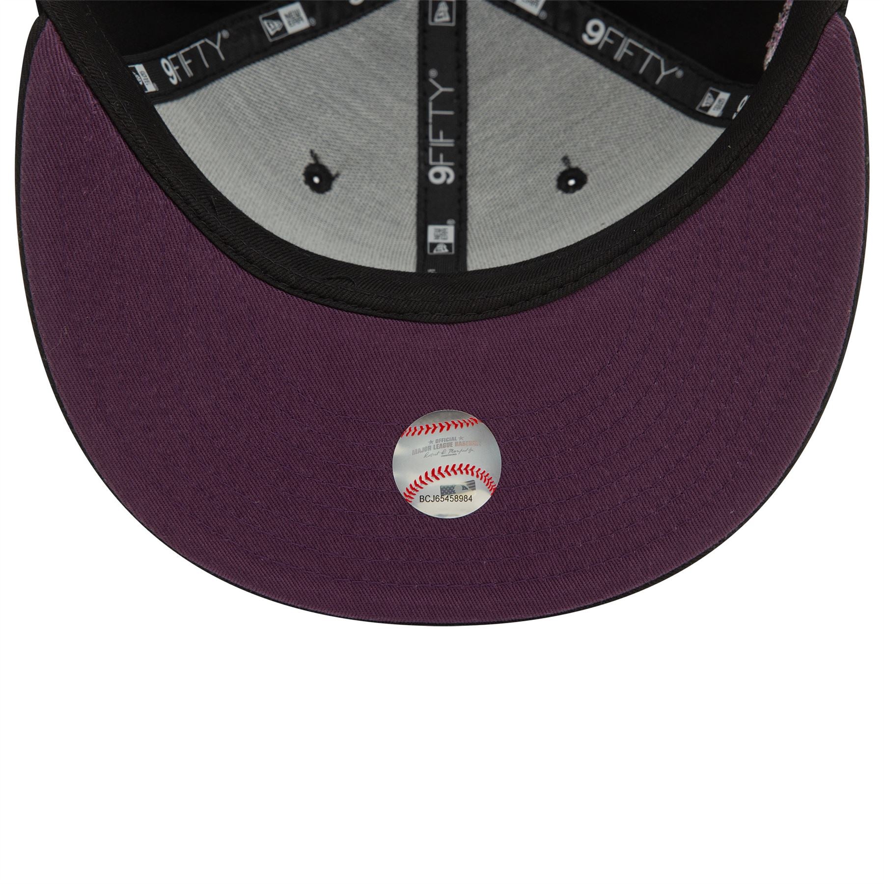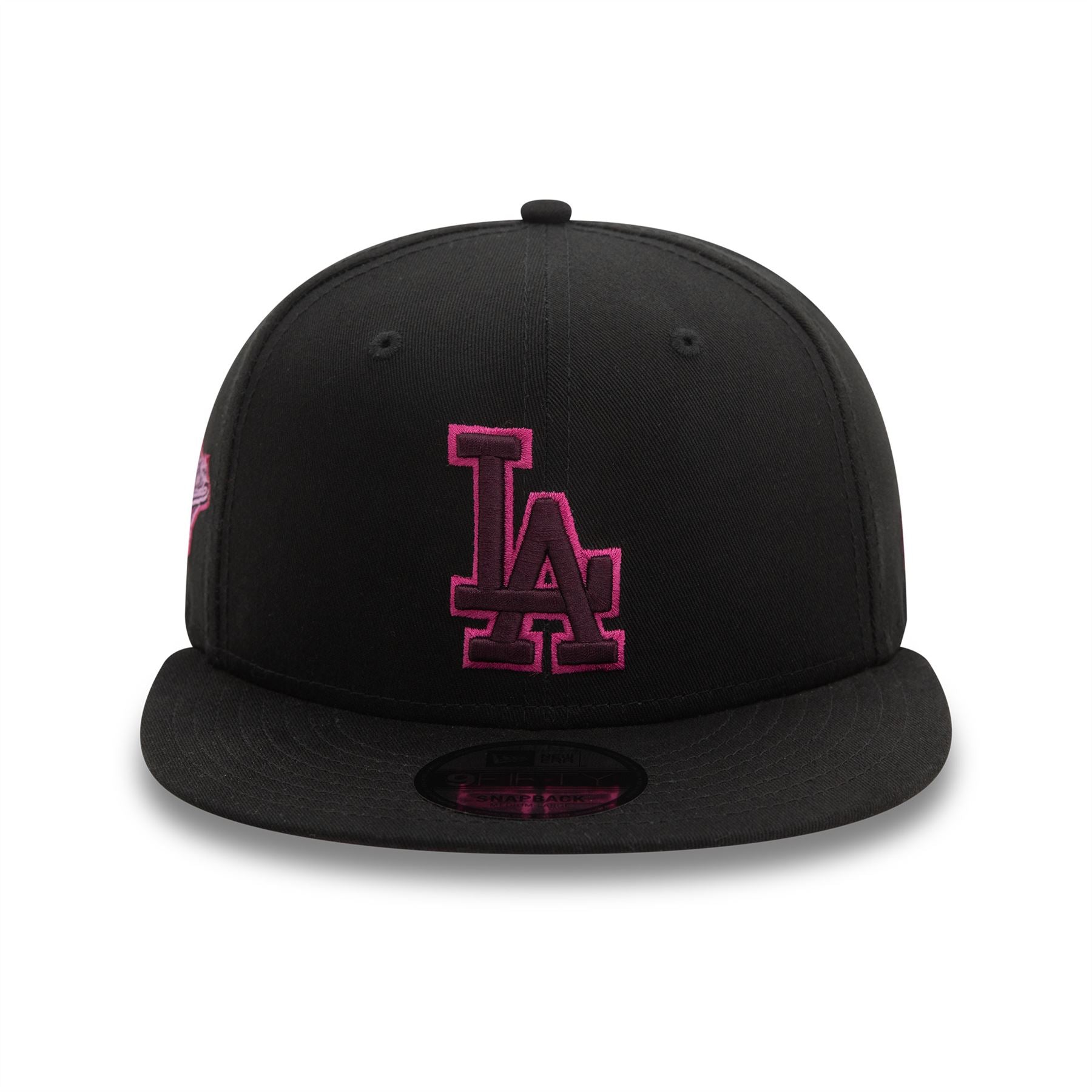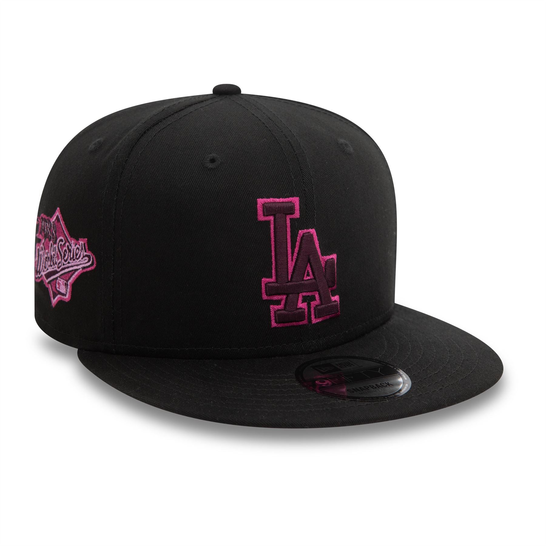 LA Dodgers Seasonal World Series Black 9FIFTY Snapback Cap. Embroidered LA Dodgers logo on front. World Series sidepatch on right. Embroidered New Era flag on left. 6 panel structured crown. Flat visor with rear snapback fastener. Black Cap with dark purple undervisor.