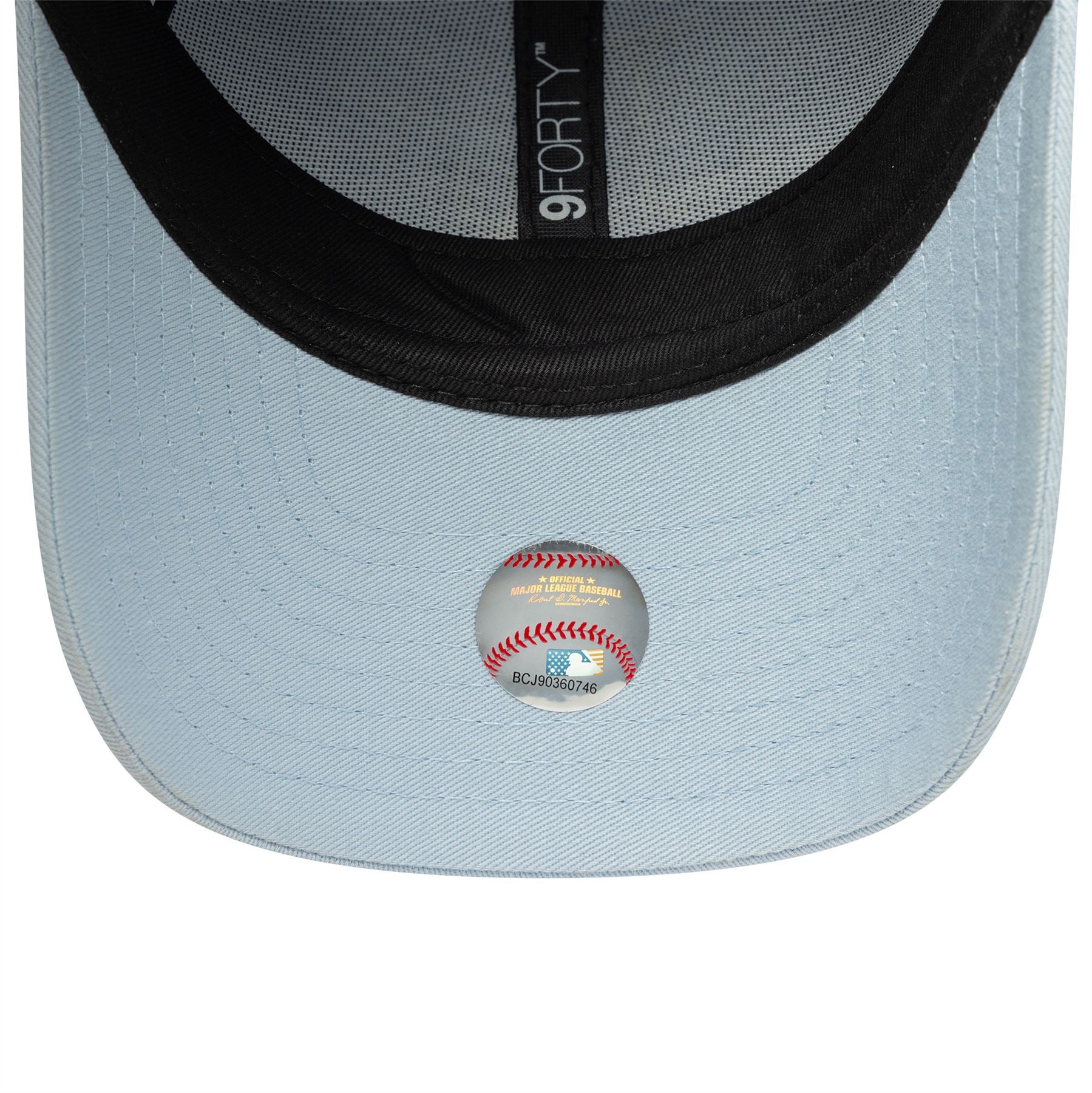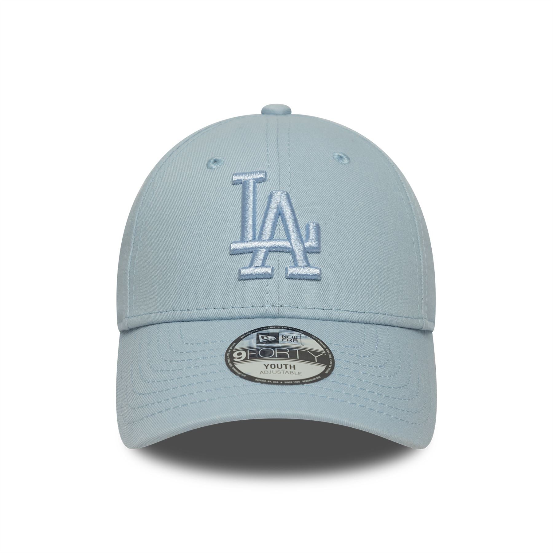 Embroidered LA Dodgers logo on front. Embroidered New Era flag on left. 6 panel structured crown. Curved visor with rear strapback fastener. Pastel blue Cap with pastel blue undervisor.