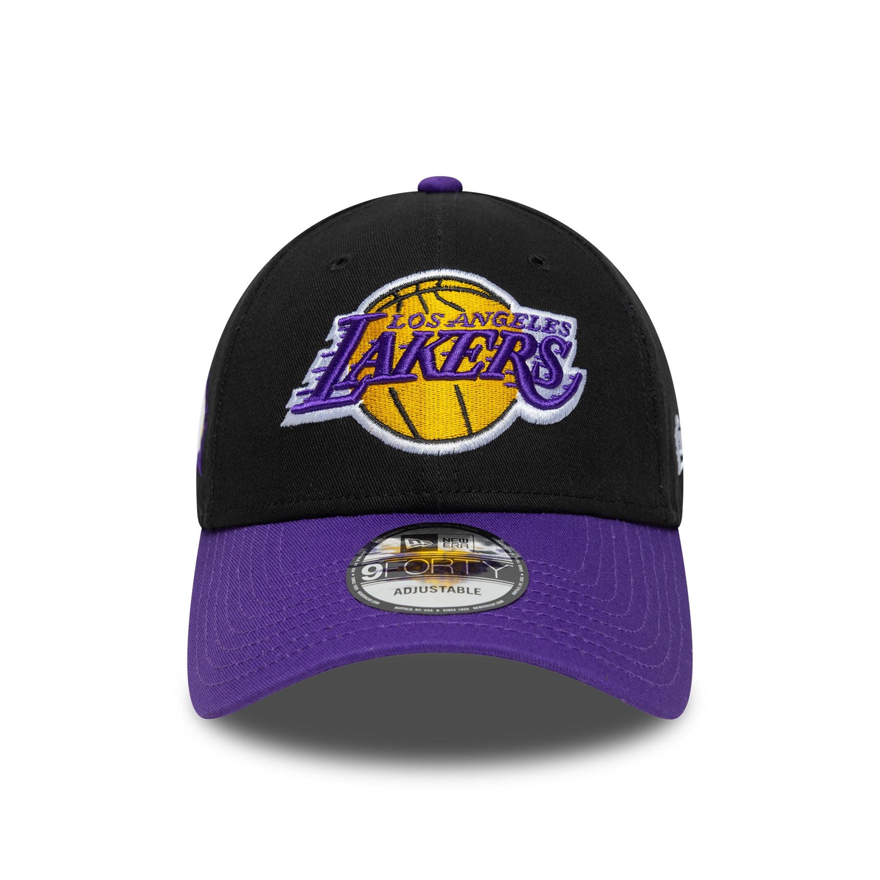 Embroidered LA Lakers logo on front. Embroidered LA Lakers sidepatch on right. Embroidered New Era flag on left. 6 panel structured crown. Curved visor with rear strapback fastener. Black Cap with purple undervisor.