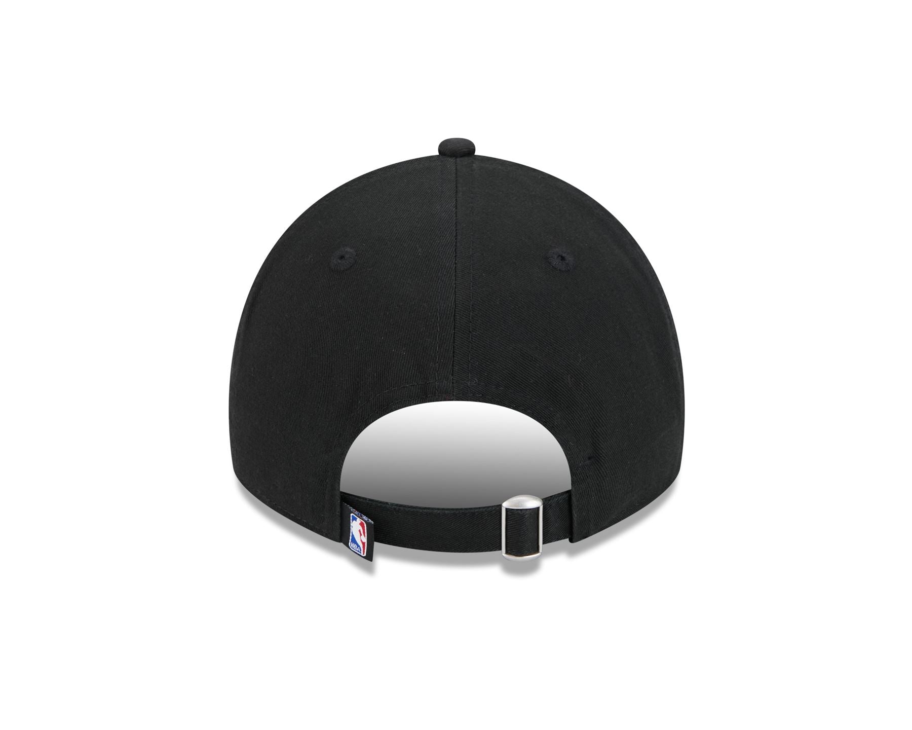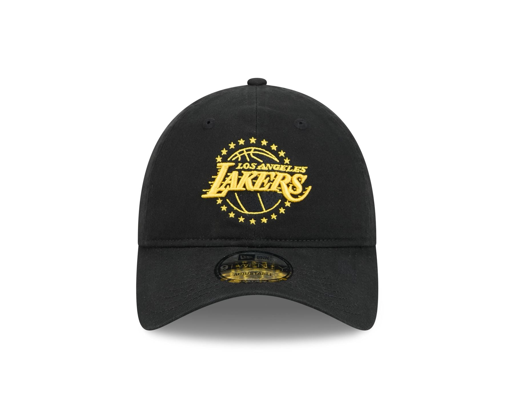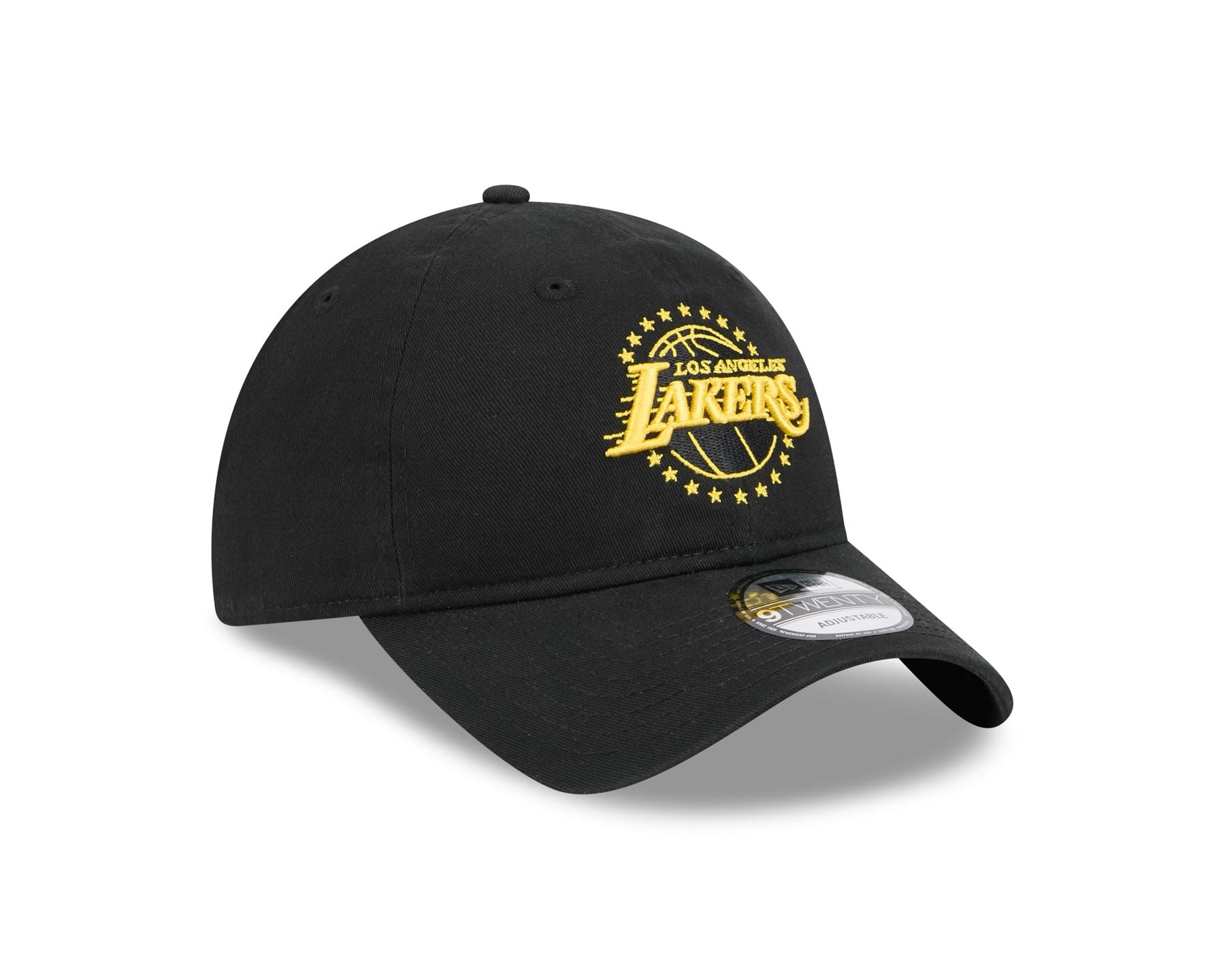 LA Lakers NBA24 9Twenty Adjustable New Era Cap. Embroidered LA Lakers logo on front. Embroidered New Era flag on left. 6 panel unstructured crown which can be folded into a bag. Curved visor with rear strapback fastener. NBA patch logo on rear fastener. Black Cap with black undervisor.