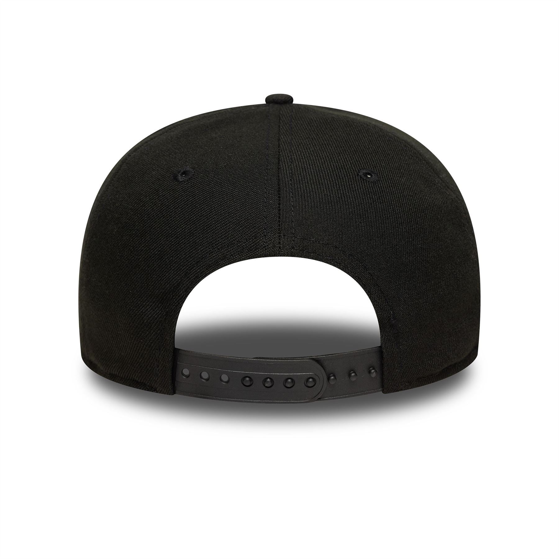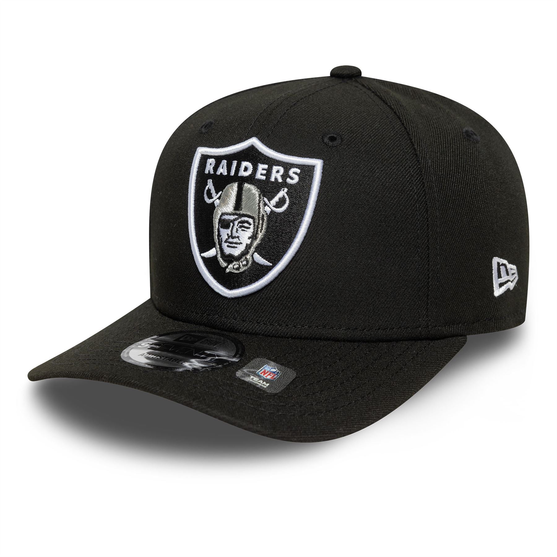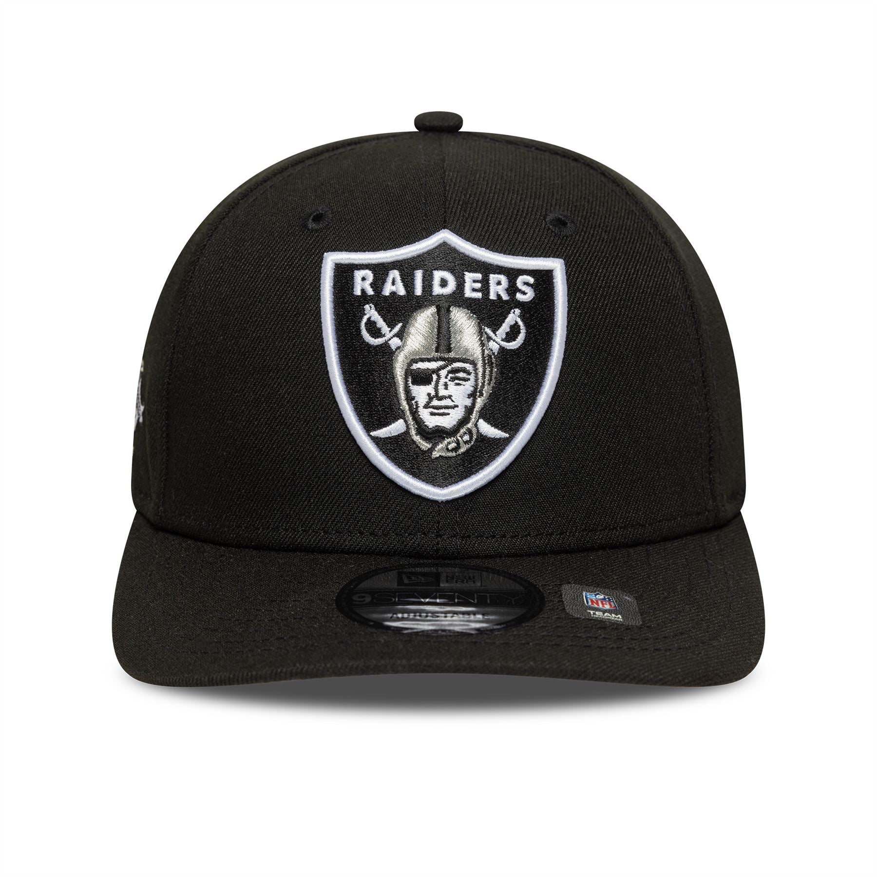Embroidered Las Vegas Raiders logo on front. Super Bowl sidepatch on right. Embroidered New Era flag on left. 6 panel structured crown. Stretch snap. Curved visor with rear snapback fastener. Black Cap with grey undervisor.