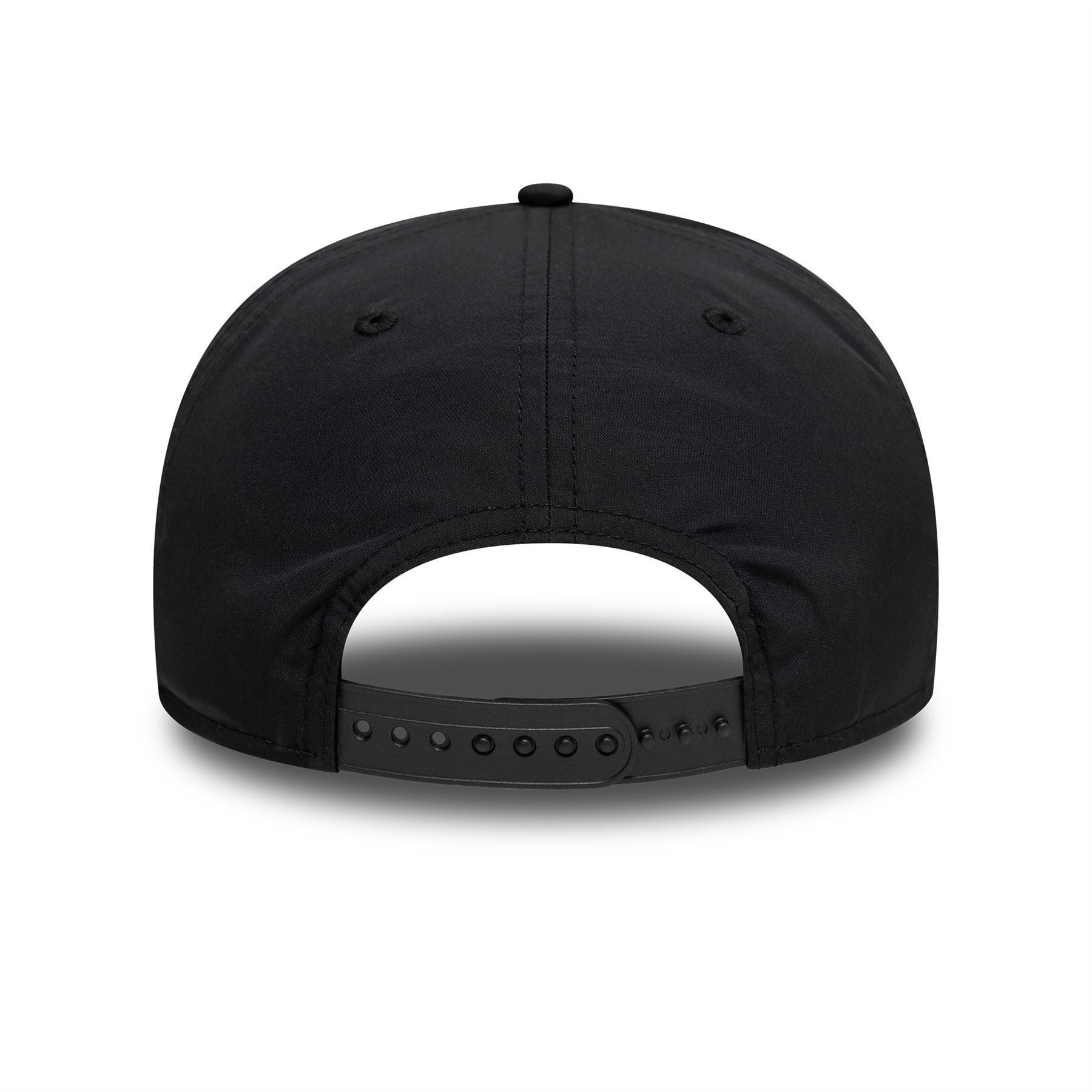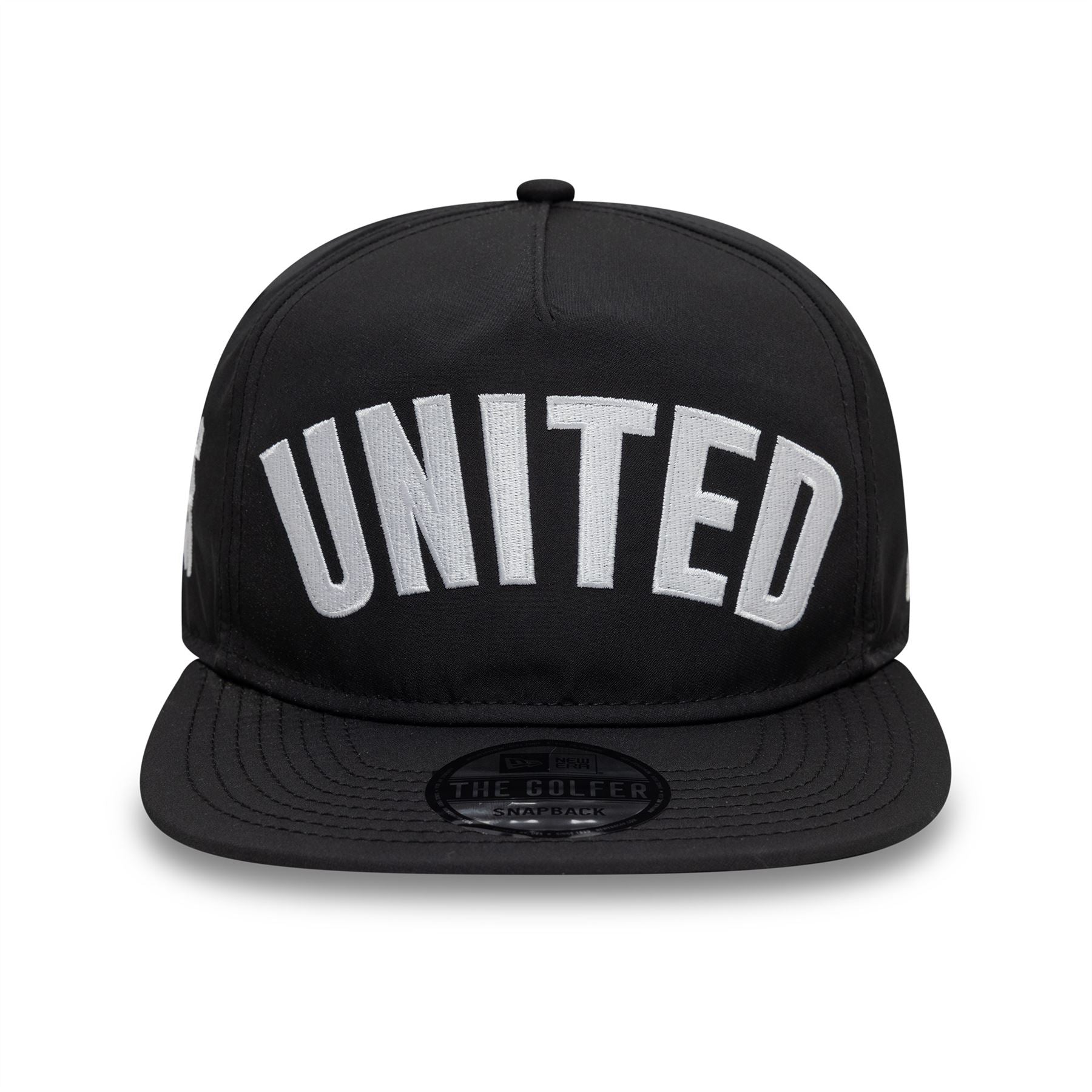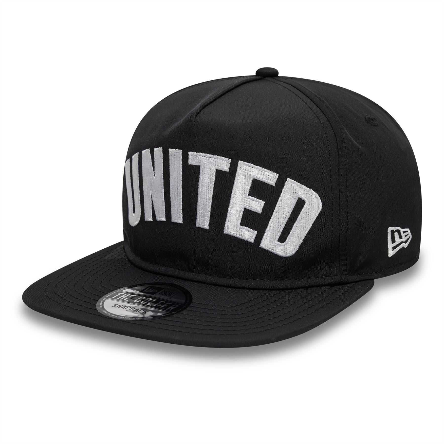Embroidered United logo on front. Embroidered New Era flag on left. Embroidered Manchester United FC logo on right 6 panel unstructured crown that can be folded into a bag. Flat black visor with rear snapback fastener. Black coloured Cap with black undervisor.