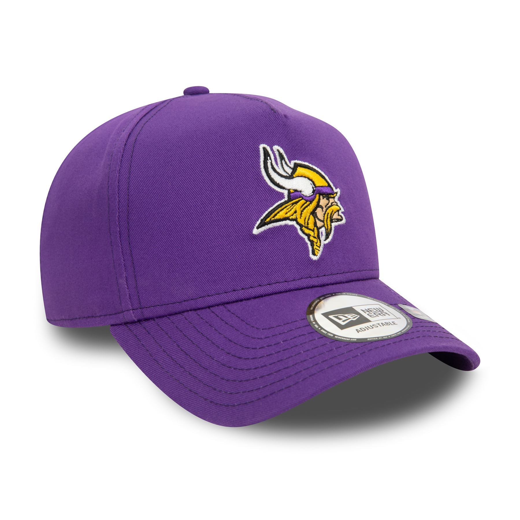 Minnesota Vikings NFL Official Team Colours Purple 9FORTY E-Frame Adjustable Cap. Embroidered Minnesota Vikings logo on front. Embroidered New Era flag on left. 6 panel structured E-Frame crown. Curved visor with rear snapback fastener. Purple Cap with purple undervisor.