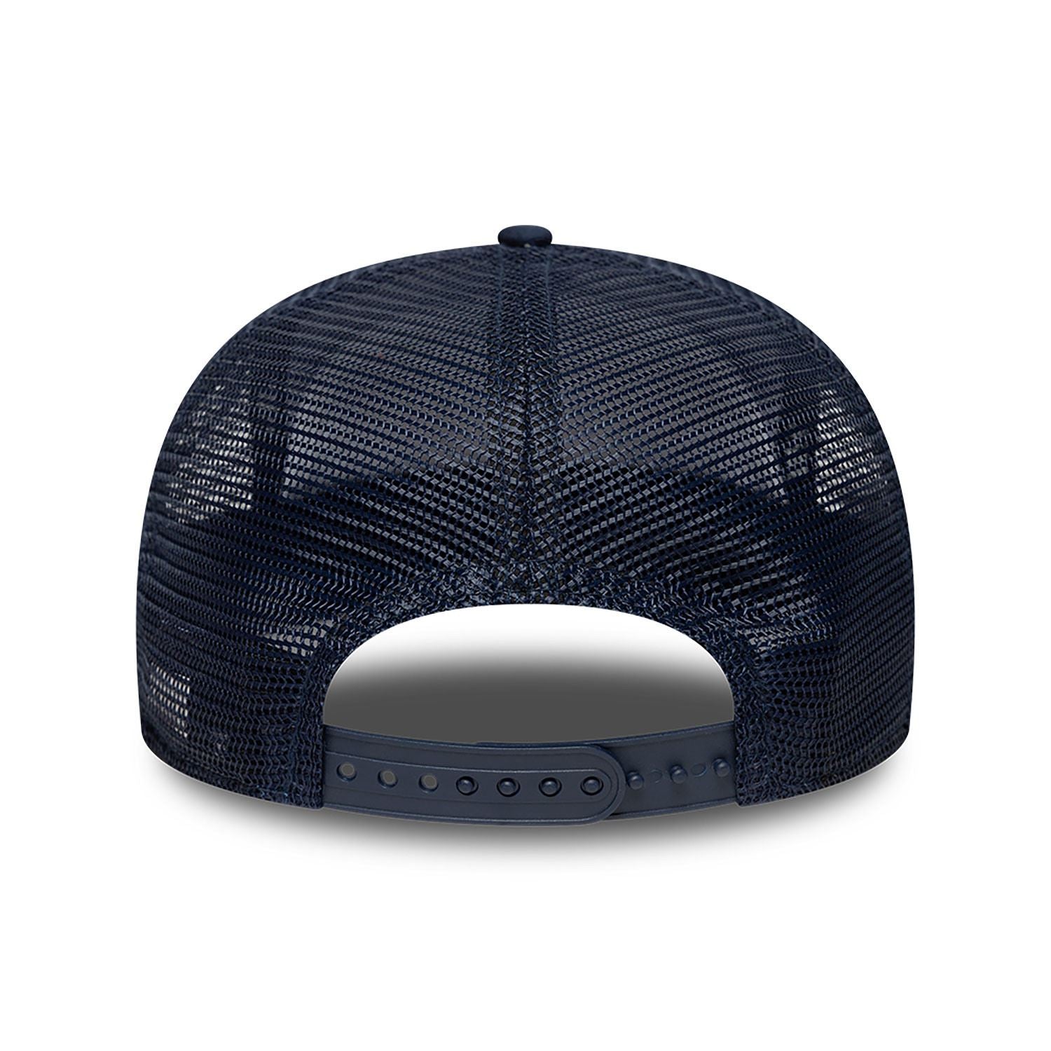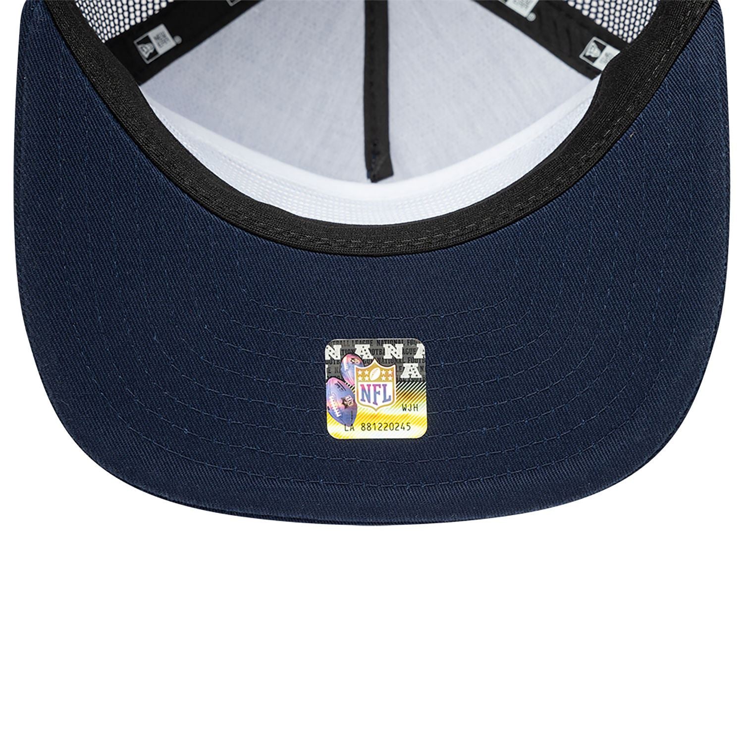 NFL International Series Games 2024 New England Patriots Golfer Cap. New England Patriots wordmark logo on front. New England Patriots sidepatch on right. Mesh back and sides. Embroidered New Era flag on left. 6 panel unstructured crown so you can fold the cap into a bag. Flat visor with rear snapback fastener. Dark blue Cap with dark blue undervisor