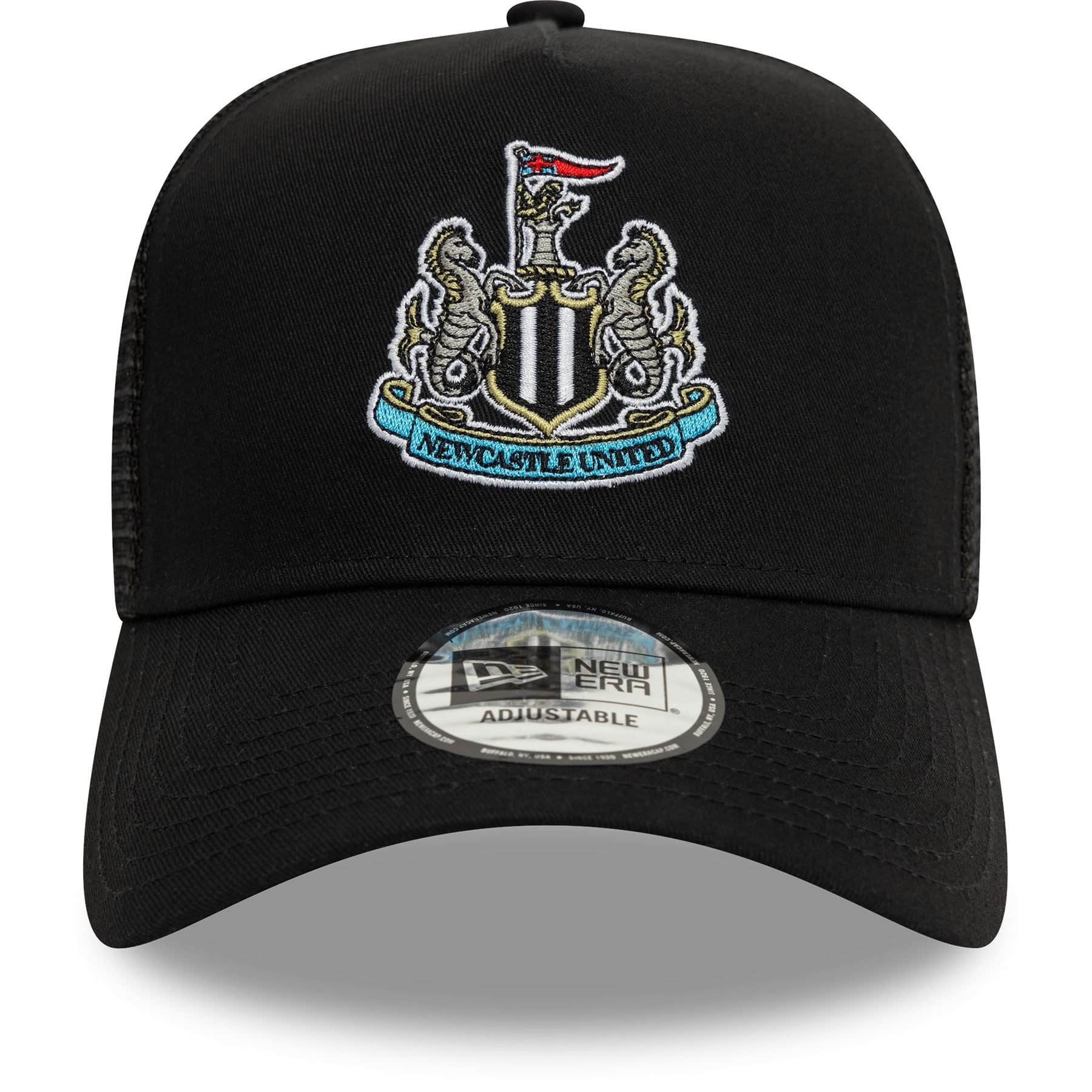Official New Era Core Newcastle United FC EF Trucker Cap. Newcastle United FC logo on front. Embroidered New Era flag on left. 6 panel structured crown. Mesh back and sides. Curved visor with rear snapback fastener. Cap colour black with black undervisor.