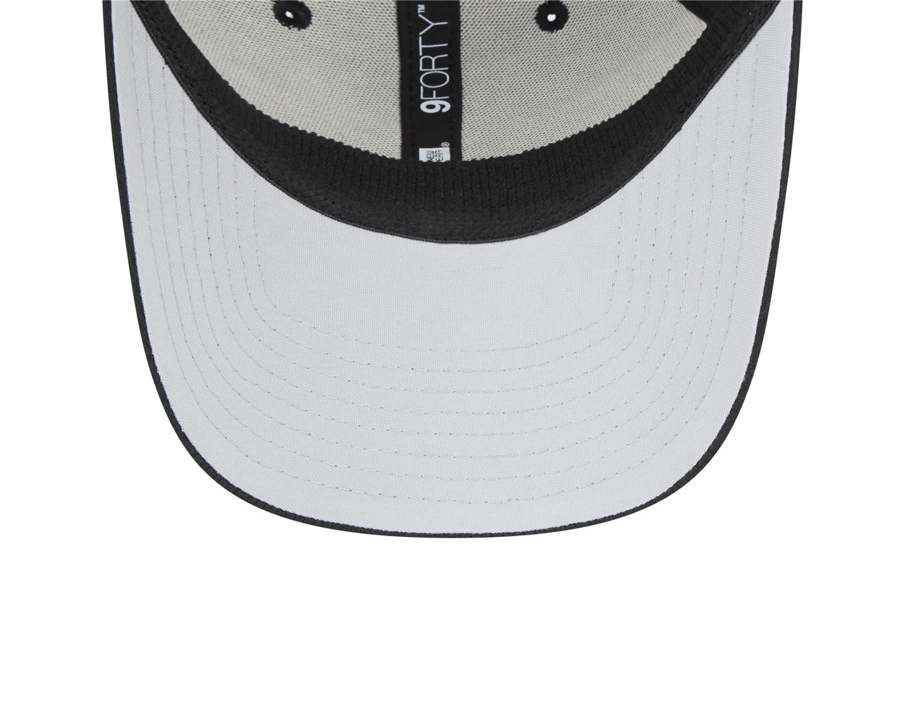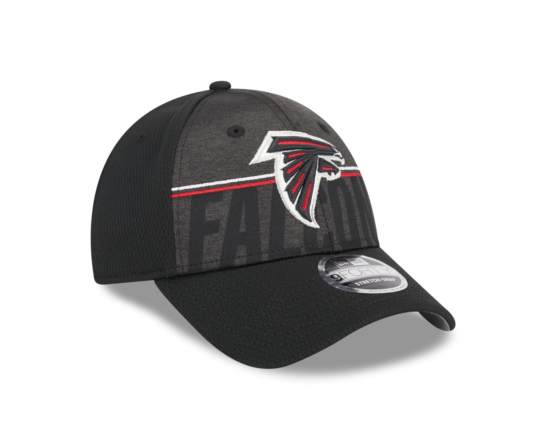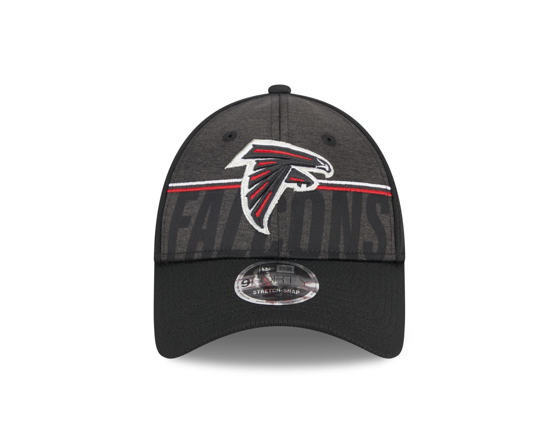 Official New Era NFL Training 2023 Atlanta Falcons 9FORTY Stretch Snap Cap. Embroidered 'Falcons' logo on front. Embroidered New Era flag on left. Embroidered NFL logo on rear. Stretch snapback. 6 panel structured crown. Curved visor with rear snapback fastener. Grey undervisor. Colour Black.