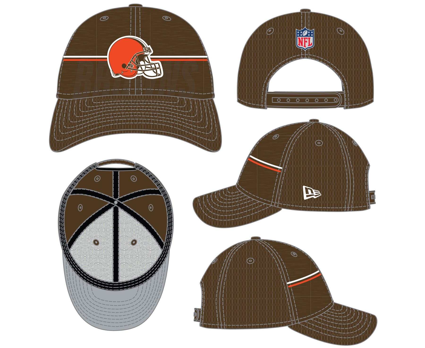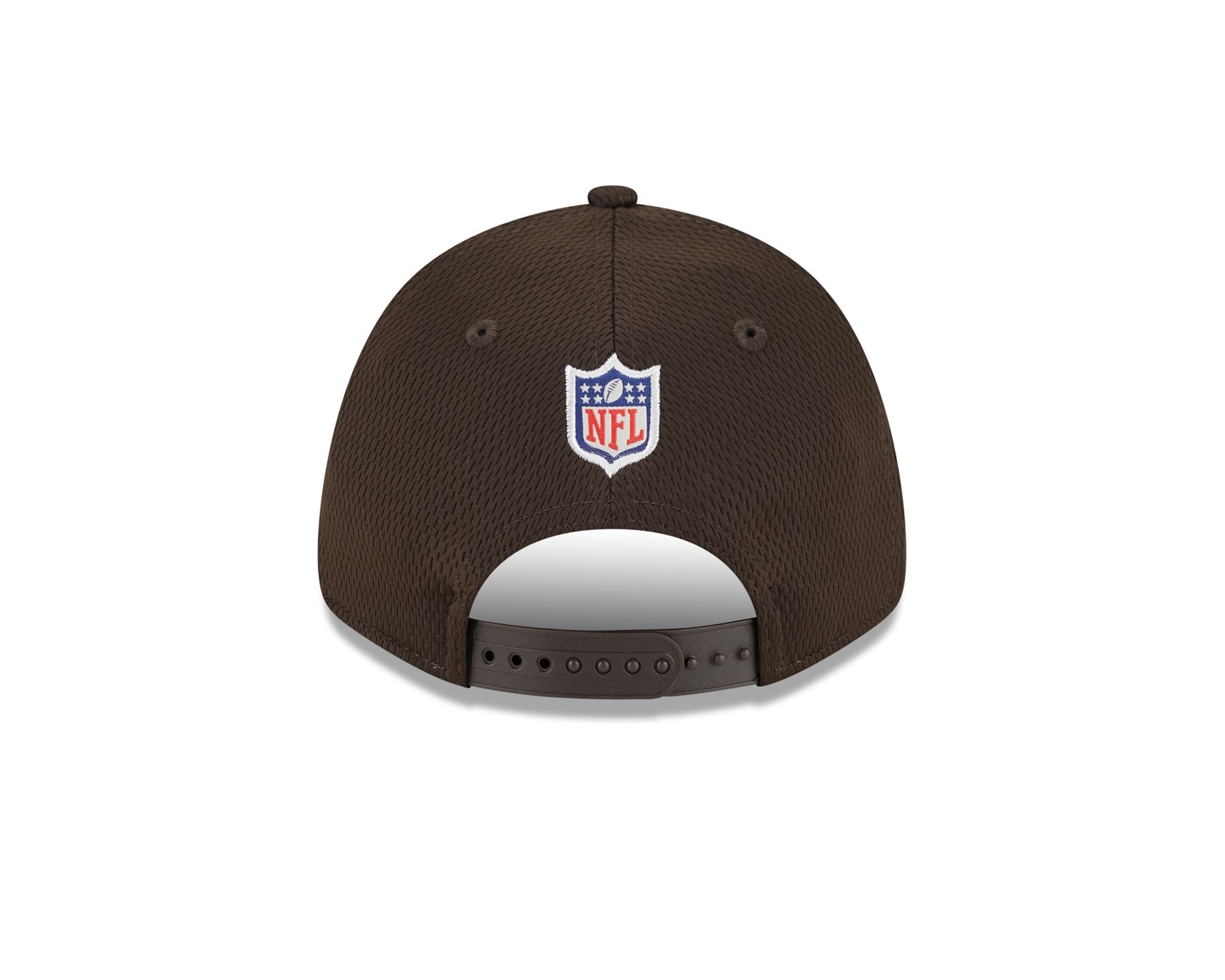 Official New Era NFL Training 2023 Cleveland Browns 9FORTY Stretch Snap Cap. Embroidered 'Browns' logo on front. Embroidered New Era flag on left. Embroidered NFL logo on rear. Stretch snapback. 6 panel structured crown. Curved visor with rear snapback fastener. Grey undervisor. Colour Brown.