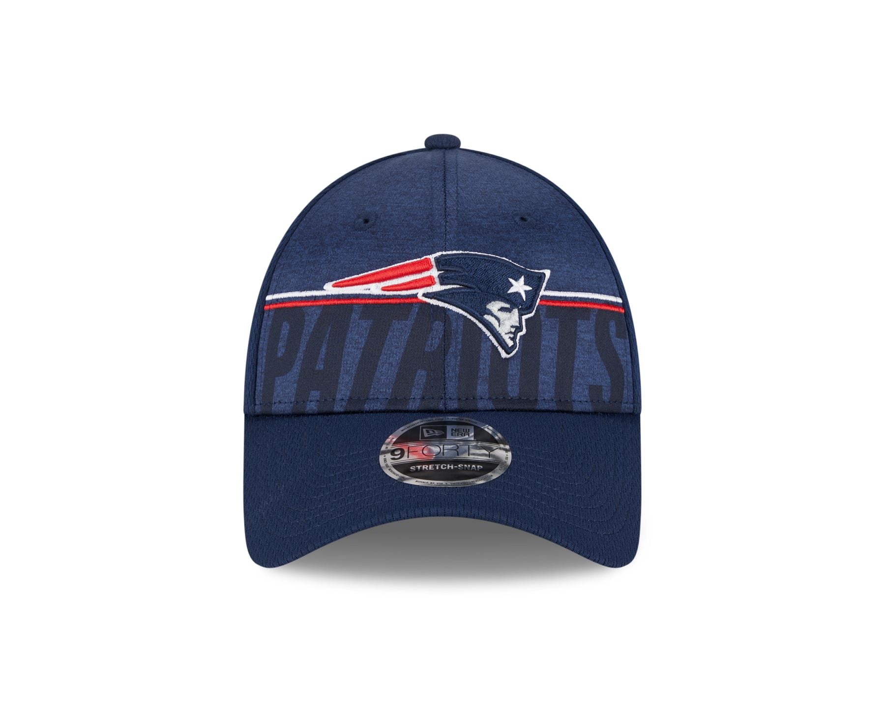 Official New Era NFL Training 2023 New England Patriots 9FORTY Stretch Snap Cap. Embroidered 'Patriots' logo on front. Embroidered New Era flag on left. Embroidered NFL logo on rear. Stretch snapback. 6 panel structured crown. Curved visor with rear snapback fastener. Grey undervisor. Colour Blue.