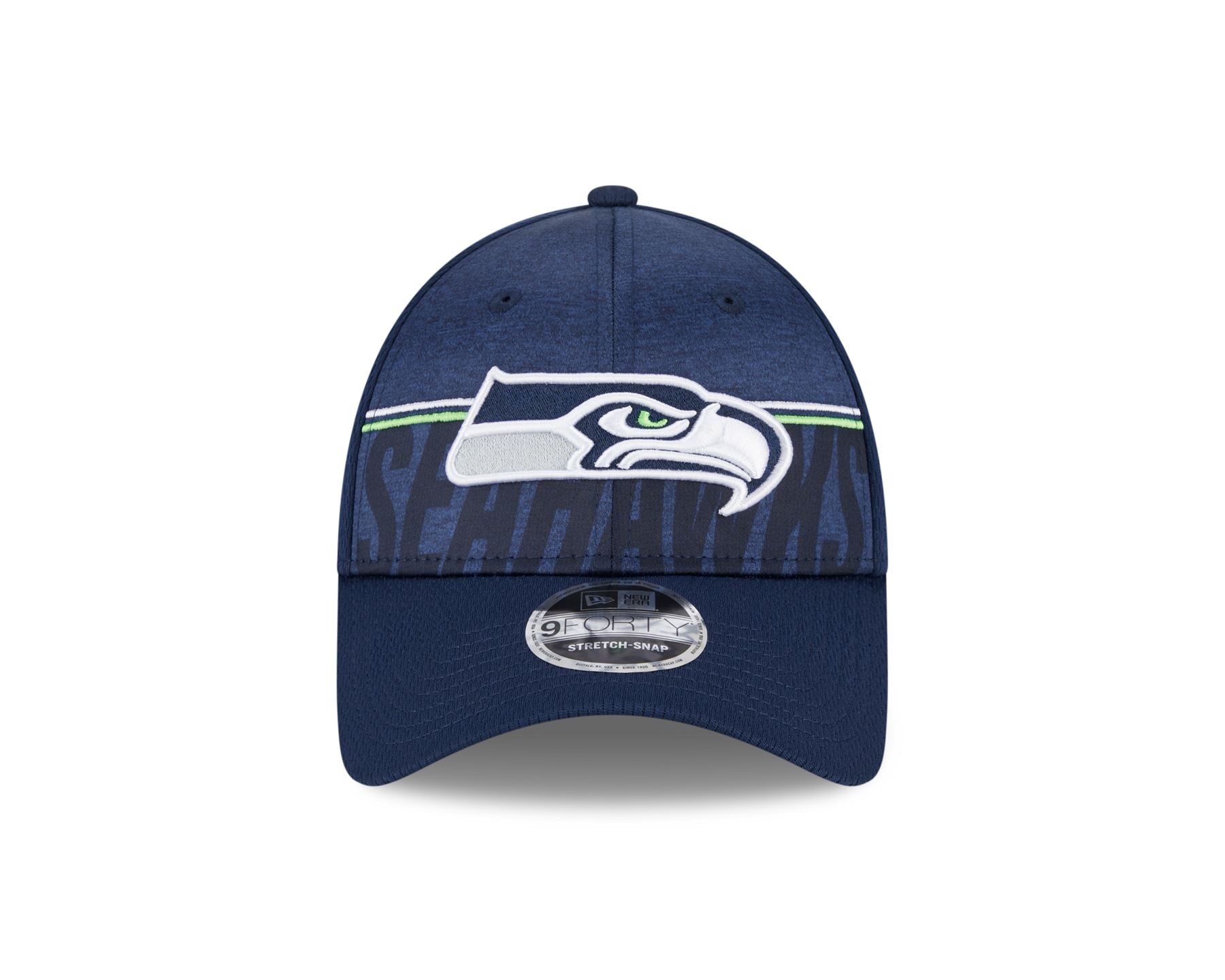 Official New Era NFL Training 2023 Seattle Seahawks 9FORTY Stretch Snap Cap. Embroidered 'Seahawks' logo on front. Embroidered New Era flag on left. Embroidered NFL logo on rear. Stretch snapback. 6 panel structured crown. Curved visor with rear snapback fastener. Grey undervisor. Colour Blue.