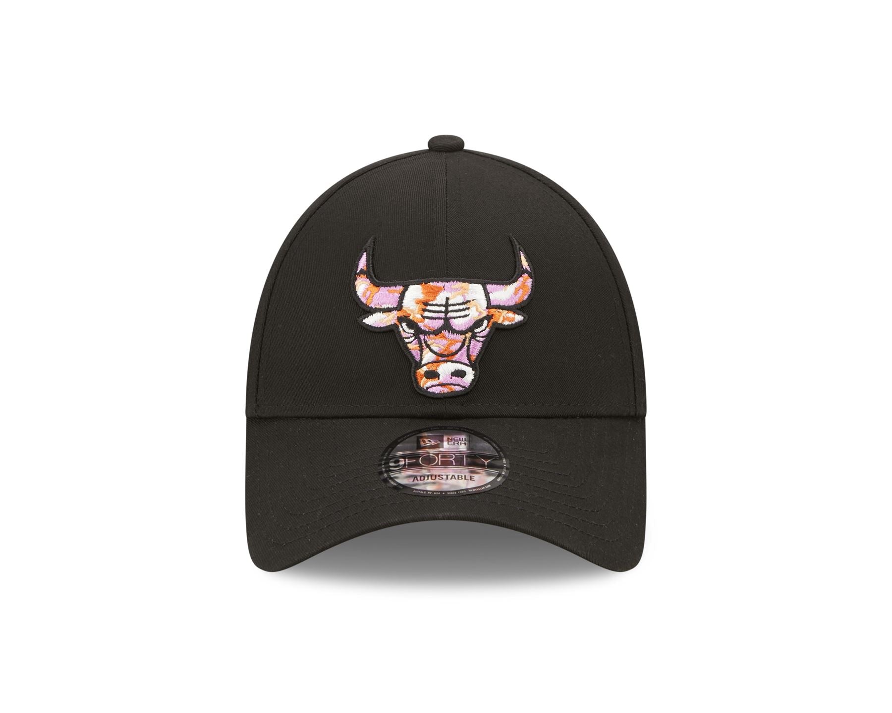 Official New Era Seasonal Infill 'Chicago Bulls' 9FORTY Cap. Embroidered 'Chicago Bulls' logo on front. Embroidered 'New Era' flag on left. 6 panel Structured crown. Rear strapback with metal fastener. Curved visor. Colour black.
