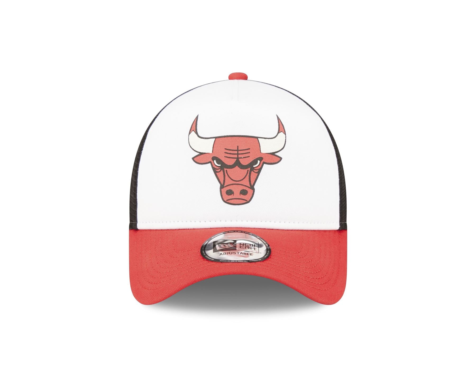 Official New Era Team Color Block 'Chicago Bulls' A-Frame Trucker Cap. Printed 'Chicago Bulls' logo on front. Embroidered 'Bulls' wordmark on rear arch. Embroidered 'New Era' flag on left. 6 panel Structured crown. Mesh rear panels. Snapback rear fastener with 'Bulls' woven label. Curved visor. Colour white.