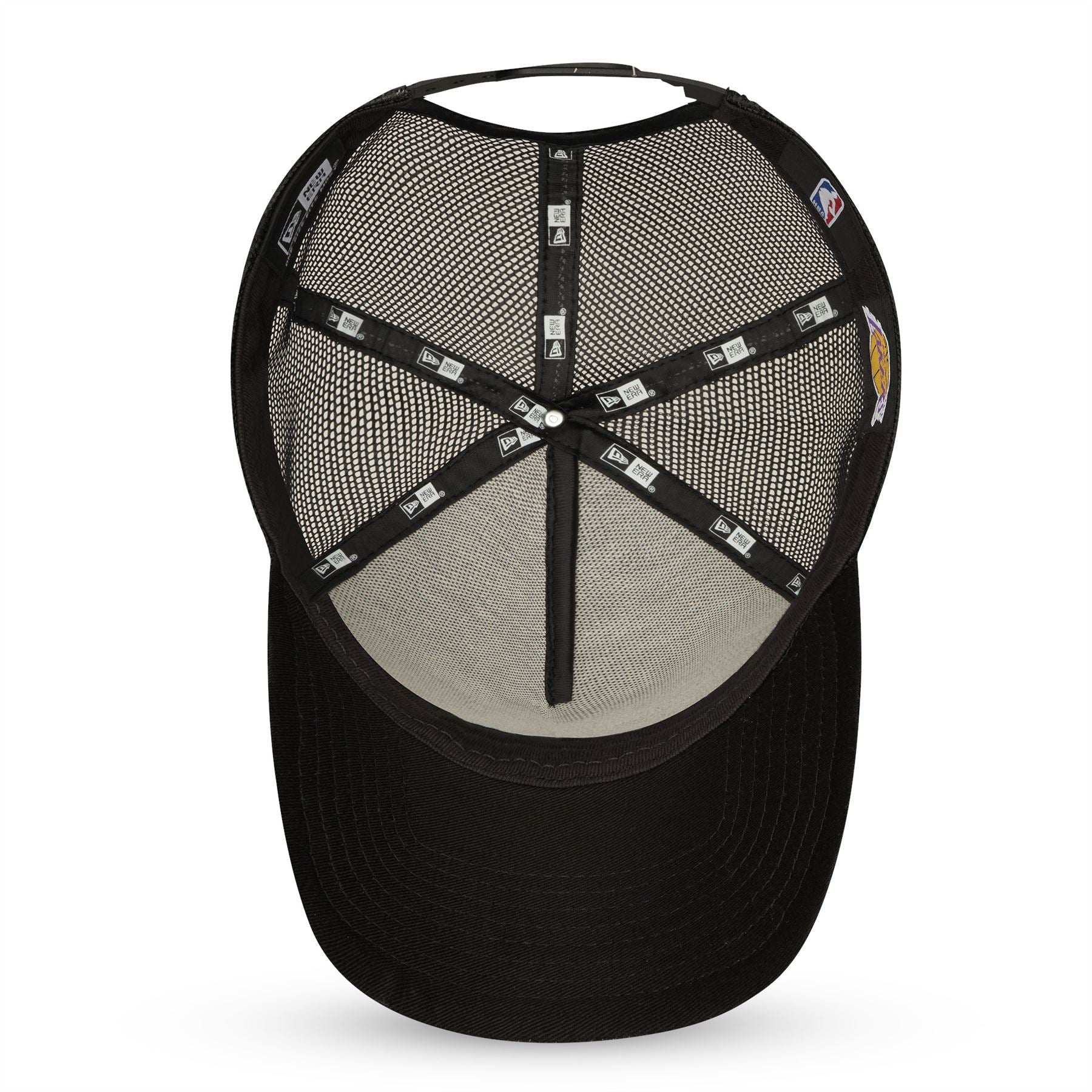 Official New Era Mens Bob Team Adjustable LA Lakers Trucker Cap. Embroidered 'LA Laker' logo on front. Embroidered New Era flag on left. 6 panel structured crown. Rear mesh panels. Curved visor with rear snapback fastener. Undervisor colour black. Cap colour black.