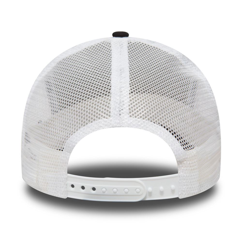 Adjustable A-Frame trucker profile. New York Yankees’ official team logo embroidered to the front of the cap in white. Black top button. White plastic snap closure to the rear. New Era flag in white stitching to the left hand side. Made from 100% Cotton woven. Colour black