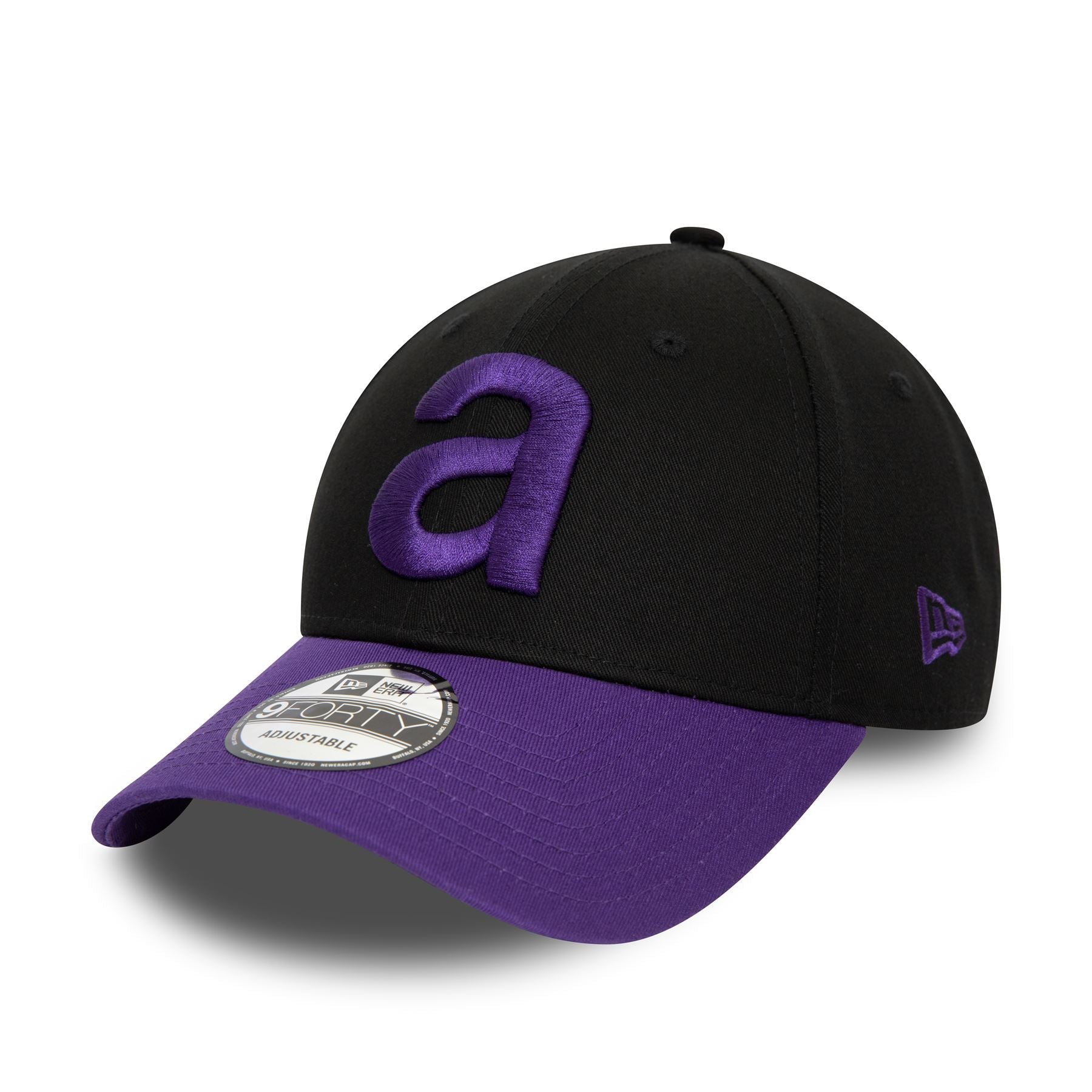 New Era Mens Contrast VSR 9Forty Aprilia Cap. Embroidered Aprilia logo on front. Embroidered New Era flag on left. 6 panel structured crown. Curved visor with rear strapback fastener. Cap colour black with purple undervisor. 100% Cotton.