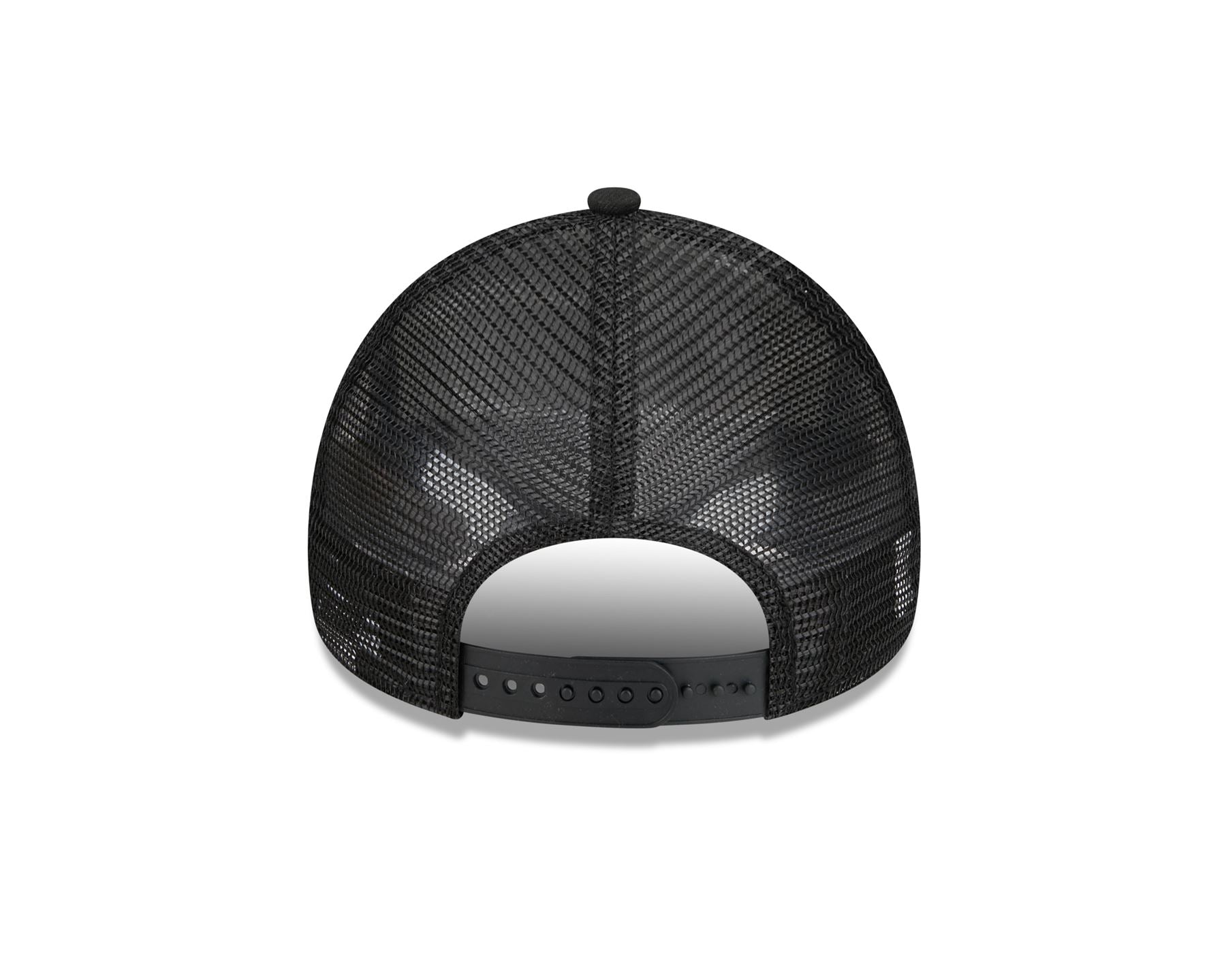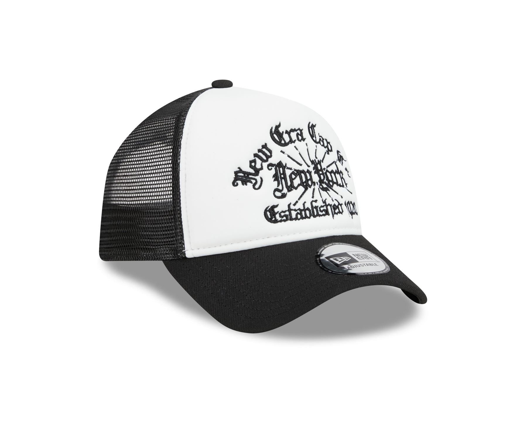 Official New Era Mens Eframe Adjustable Trucker Cap. Front embroidered "New Era" graphics. Embroidered New Era flag on left. Rear mesh panels. Curved visor with rear snapback fastener. Undervisor colour black. Cap colour white.