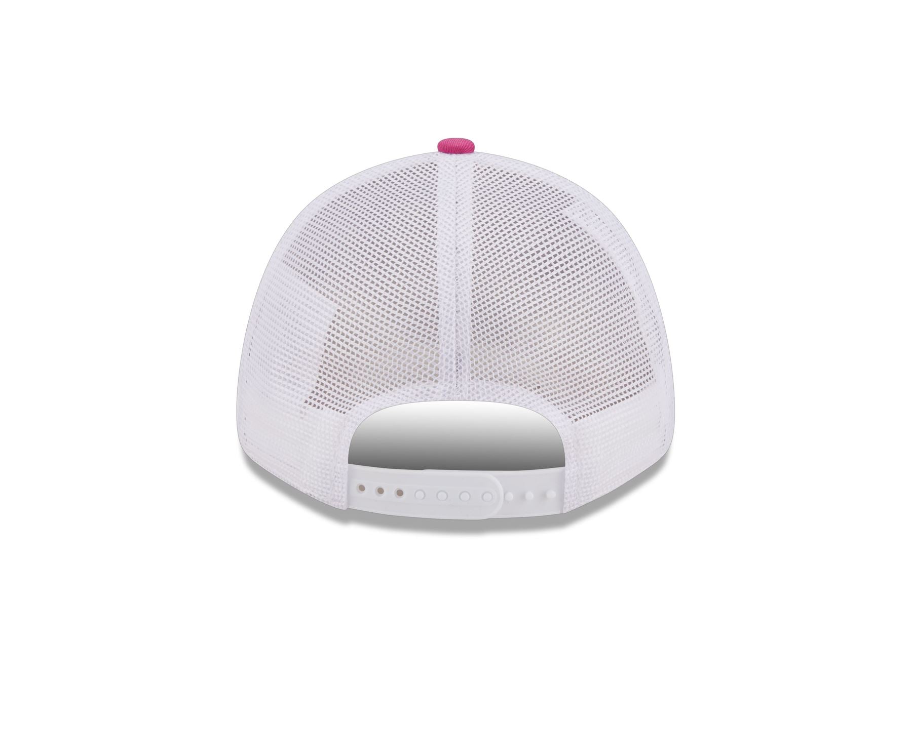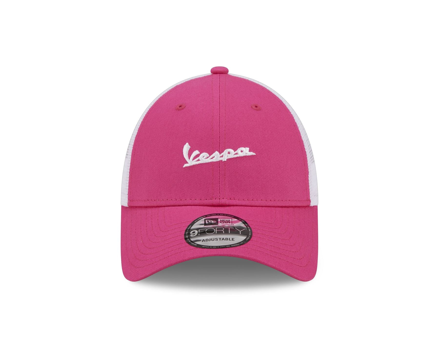Embroidered white Vespa logo on front. Structured crown. Embroidered New Era logo on side. Mid and rear white mesh panels. Snapback closure. Curved pink undervisor. MultiPanel polyester and cotton. Cap colour is pink