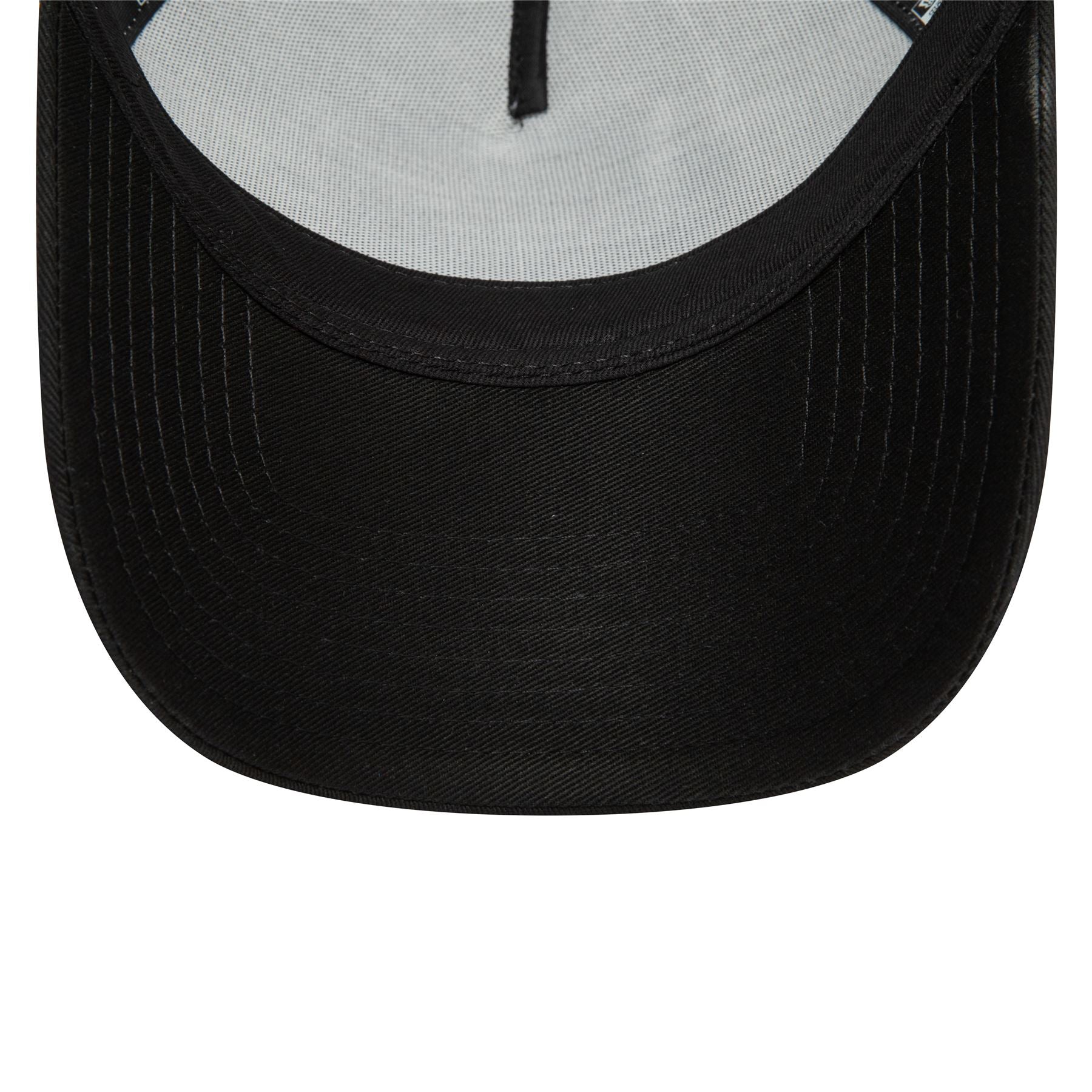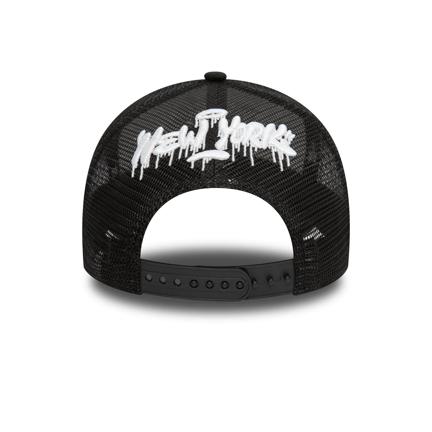 Official New Era Hot Dog Graphic A-Frame Trucker Cap. New Era Hot Dog graphic on front. New York graffiti wordmark. Embroidered New Era flag on left. 6 panel structured A-Frame crown. Mesh sides and back. Curved visor with rear snapback fastener. Cap colour white with black undervisor.