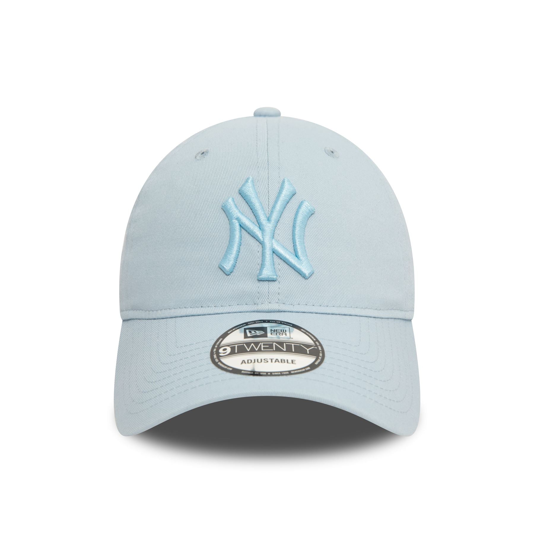 Official New Era Mens League Essential 'New York Yankees' 9Twenty Cap. Embroidered 'New York Yankees' logo on front. Embroidered New Era flag on left. 6 panel unstructured crown that allows you to fold into a bag.. Curved visor with rear strapback fastener. Cap colour light blue with light blue undervisor.