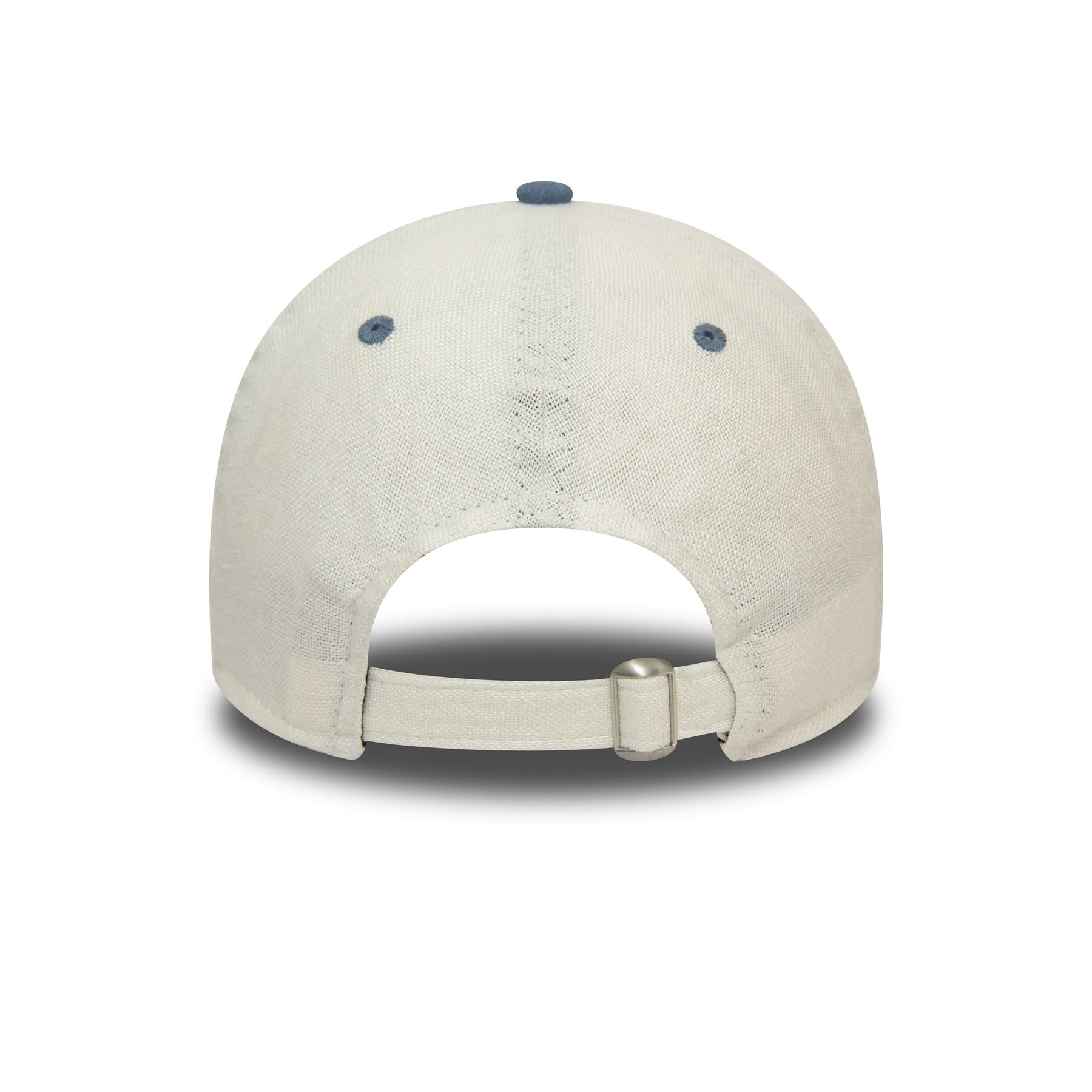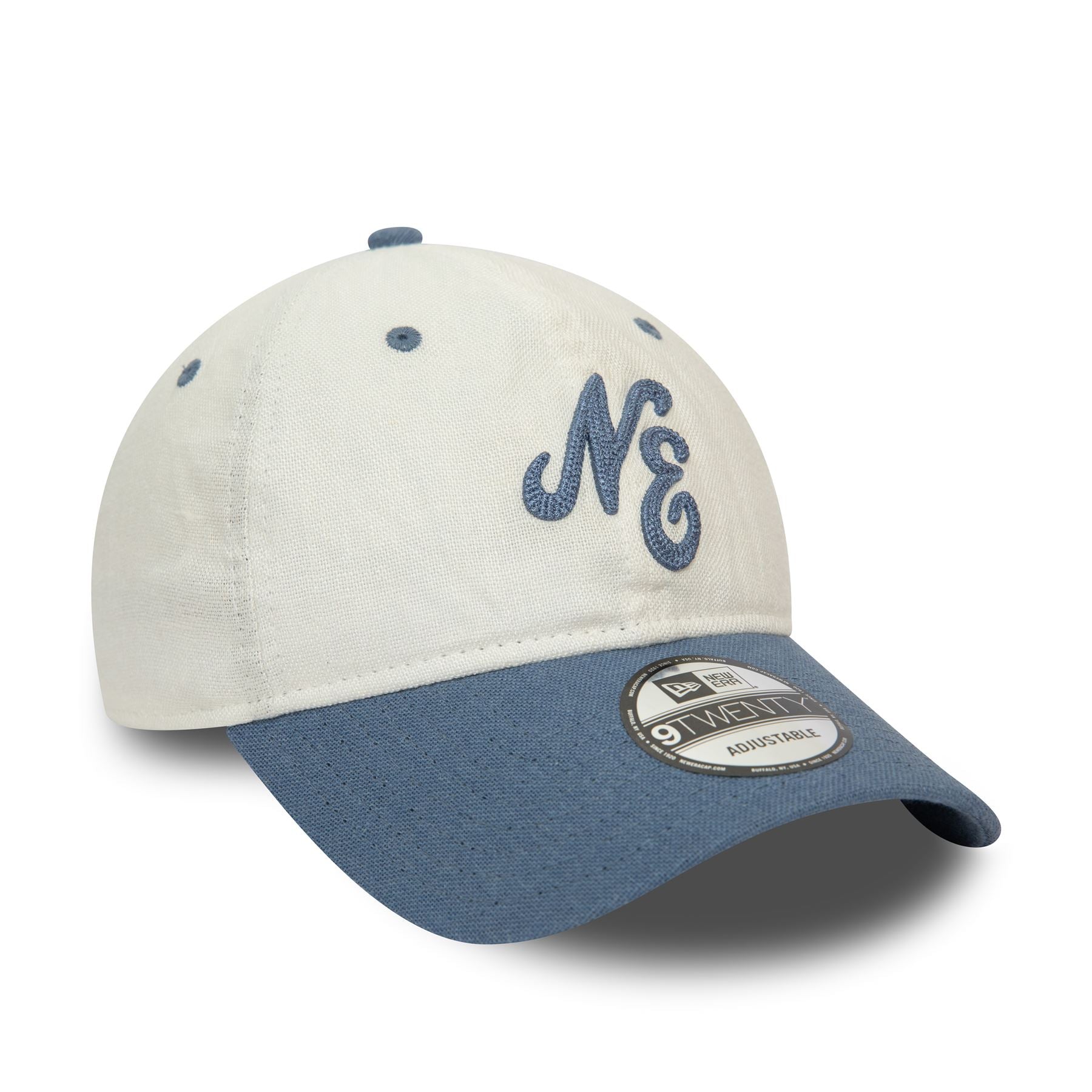 Official New Era Mens Linen Script 9Twenty Cap. 9Twenty style that can be folded into a bag. Soft linen fabric. Embroidered New Era script logo on front. Embroidered New Era flag on left. 6 panel unstructured crown. Curved visor with rear adjustable metal fastener. Cap colour off-white with washed blue undervisor.