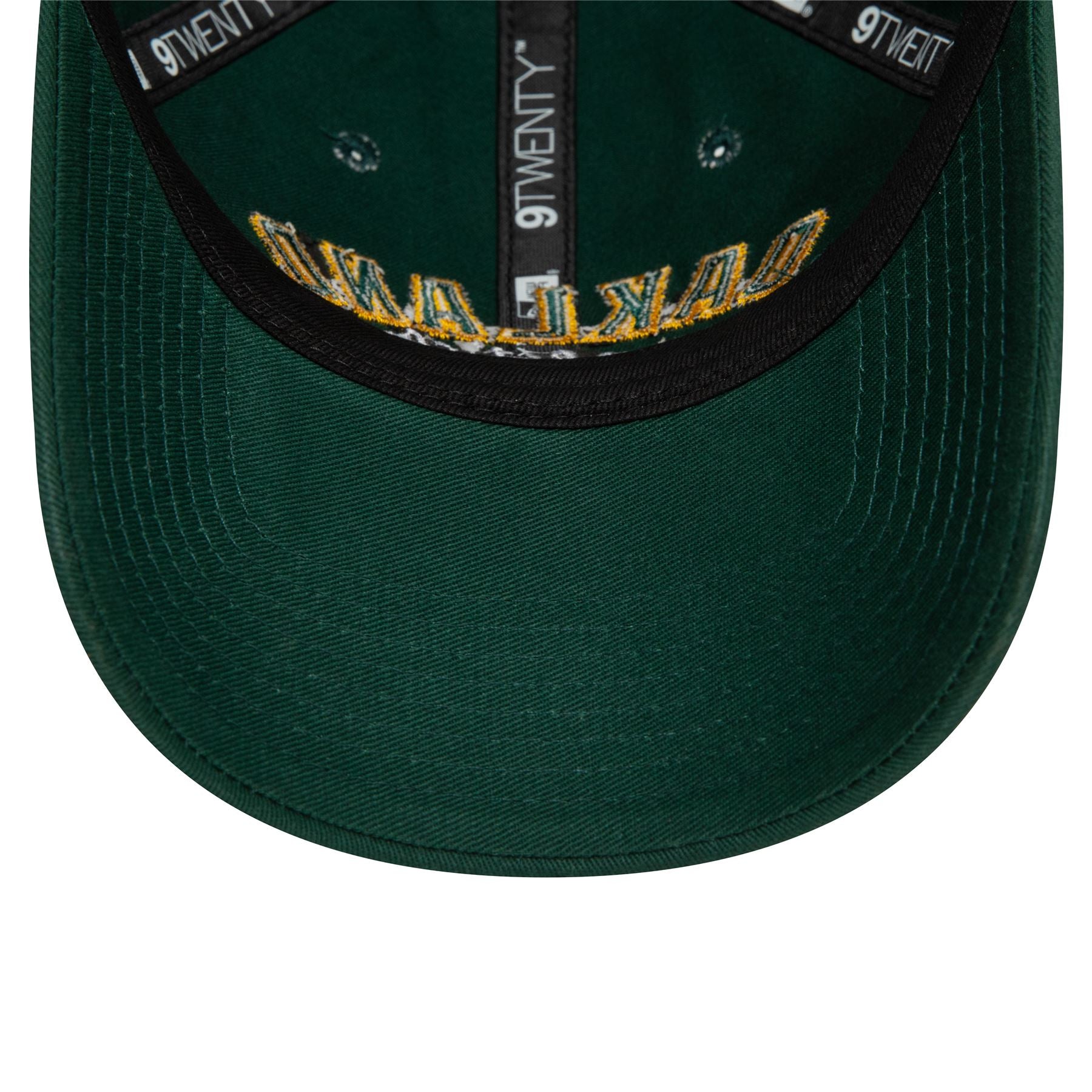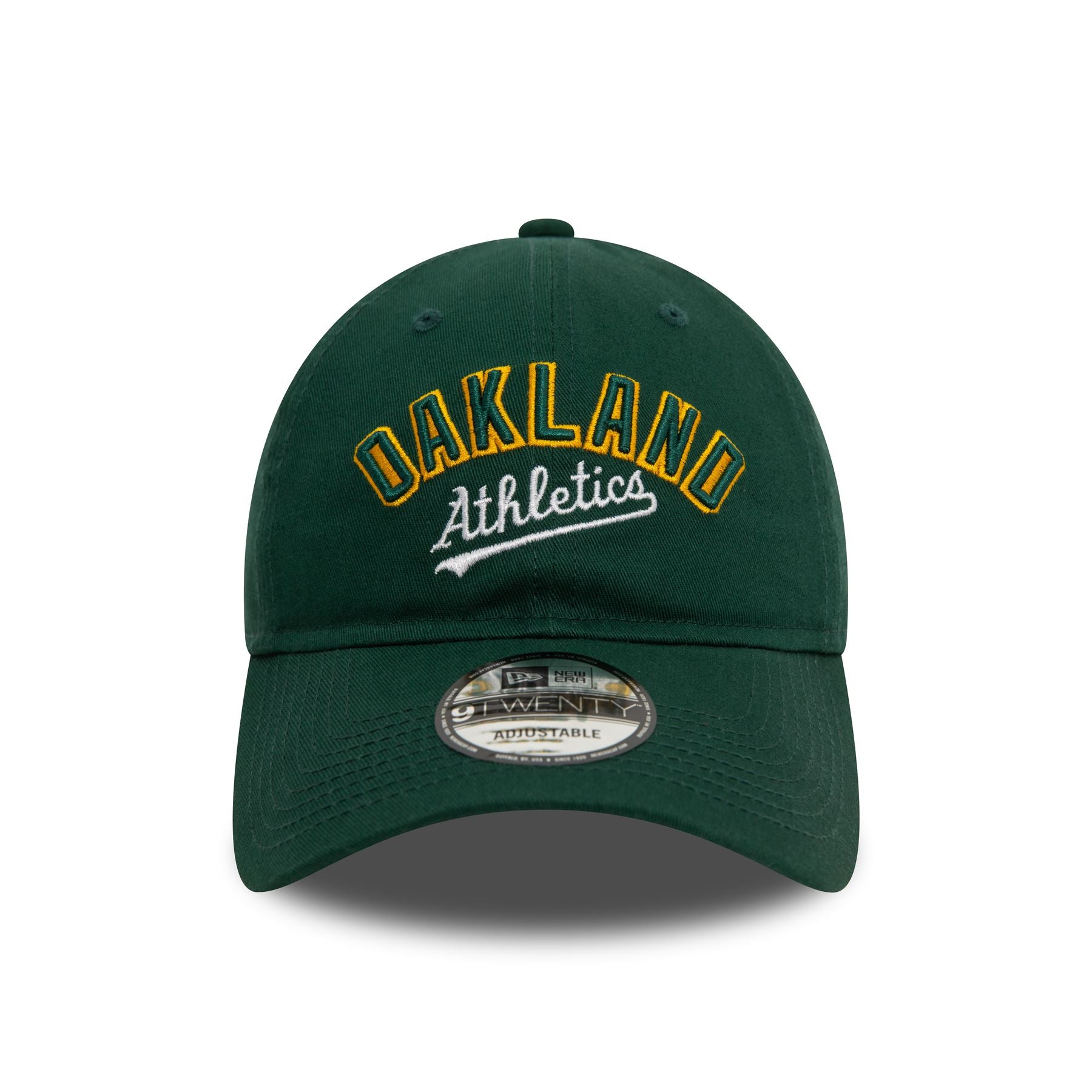 Official New Era Mens MLB 9Twenty Oakland Athletics Cap. 9Twenty style that can be folded into a bag. Embroidered Oakland Athletics name logo on front. Embroidered New Era flag on left. 6 panel unstructured crown. Curved visor with rear adjustable metal fastener. Cap colour green with green undervisor.