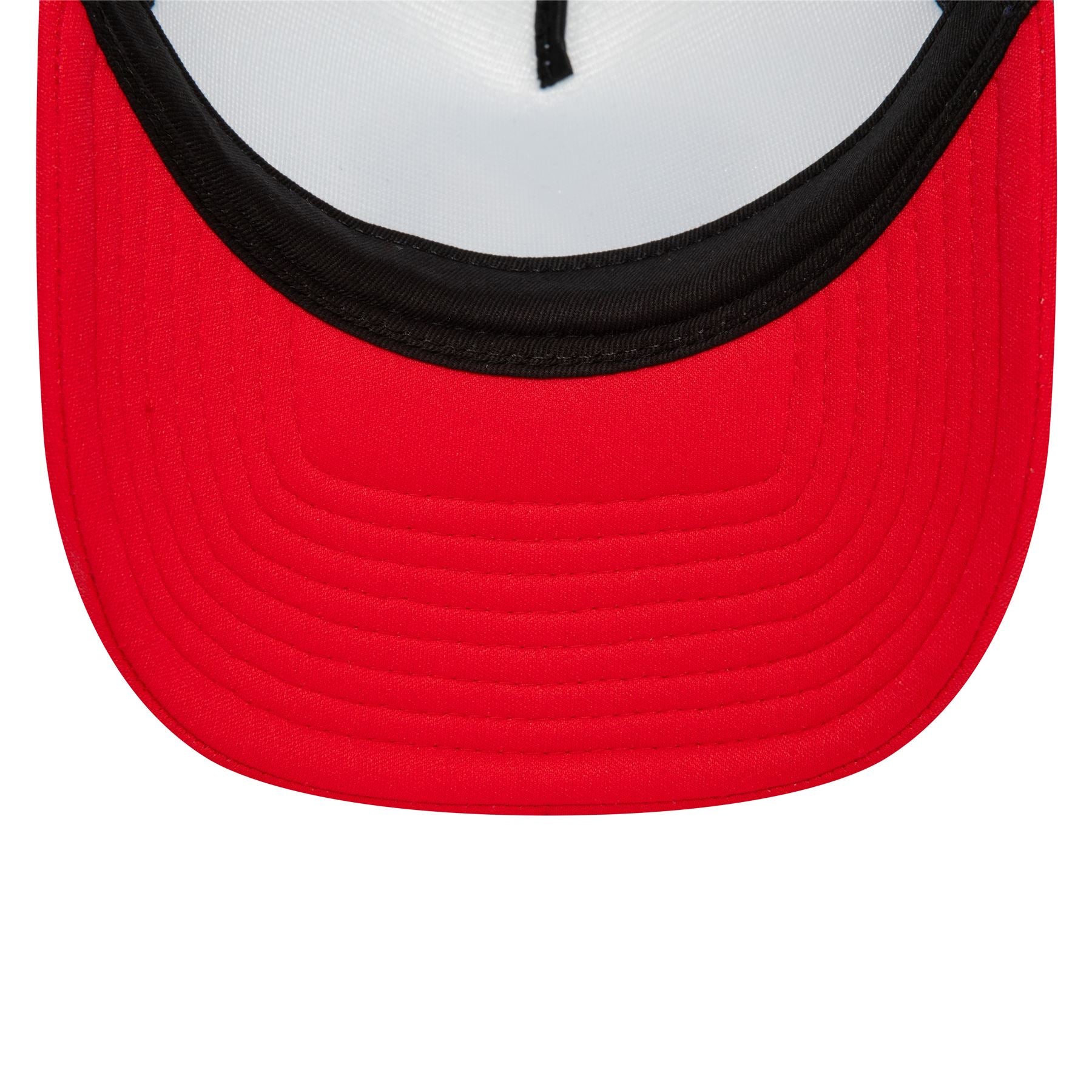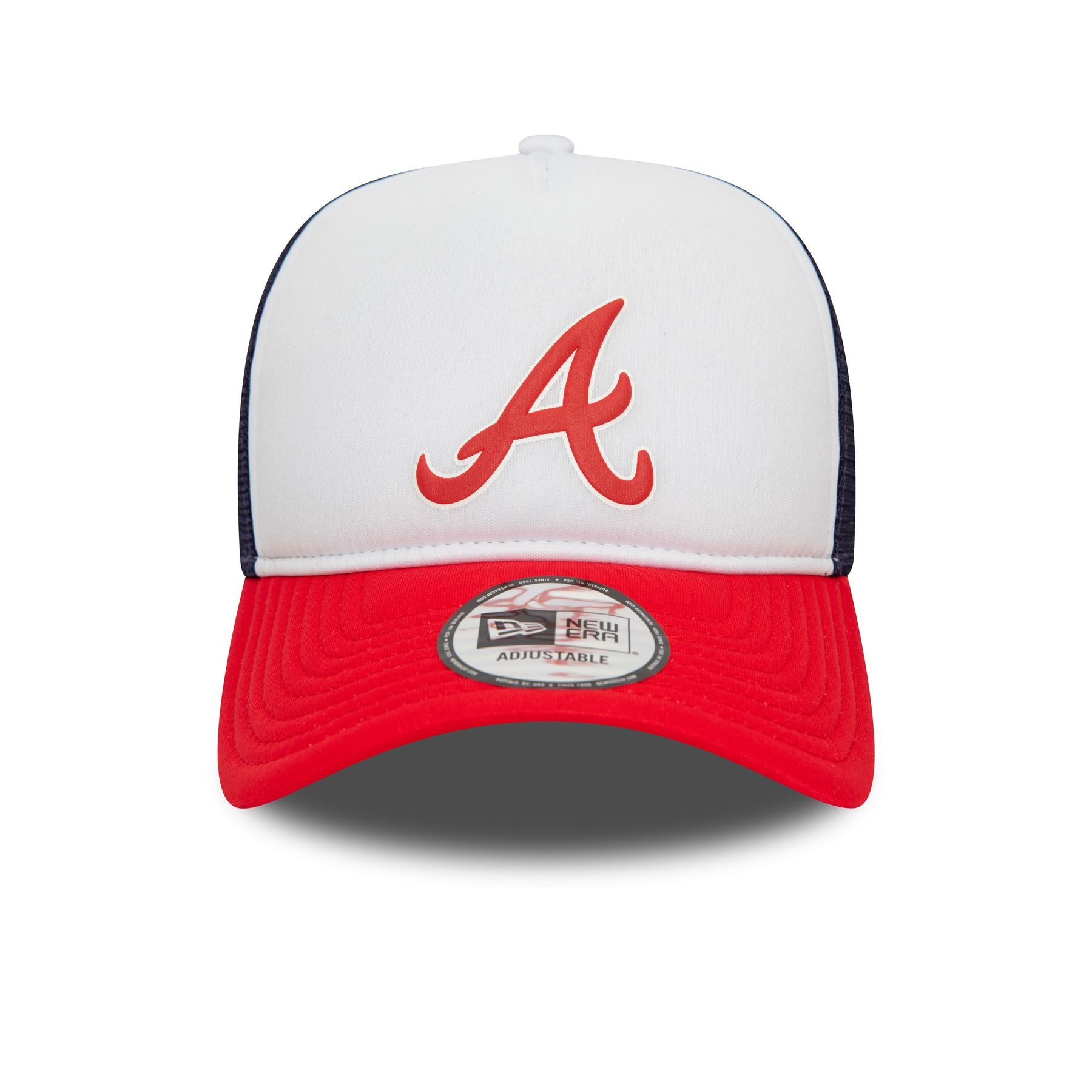 Official New Era Mens MLB Logo Atlanta Braves Trucker Cap. Foam Atlanta Braves logo on front. Embroidered 'Braves' name on rear. Embroidered New Era flag on left. 6 panel structured crown. Mesh sides and back. Curved visor with rear snapback fastener. Cap colour white with red undervisor.