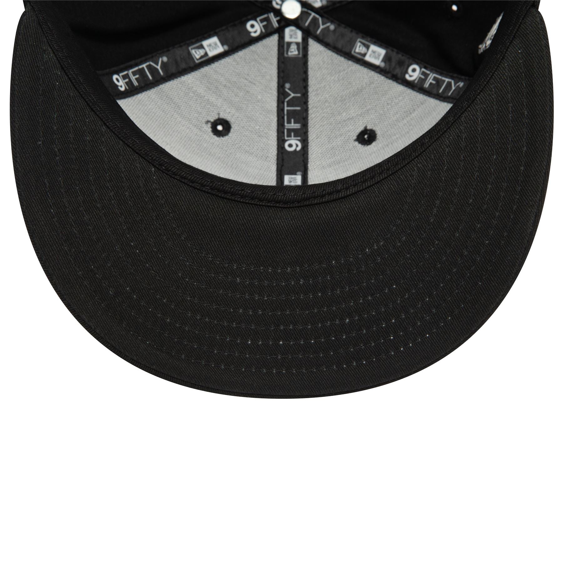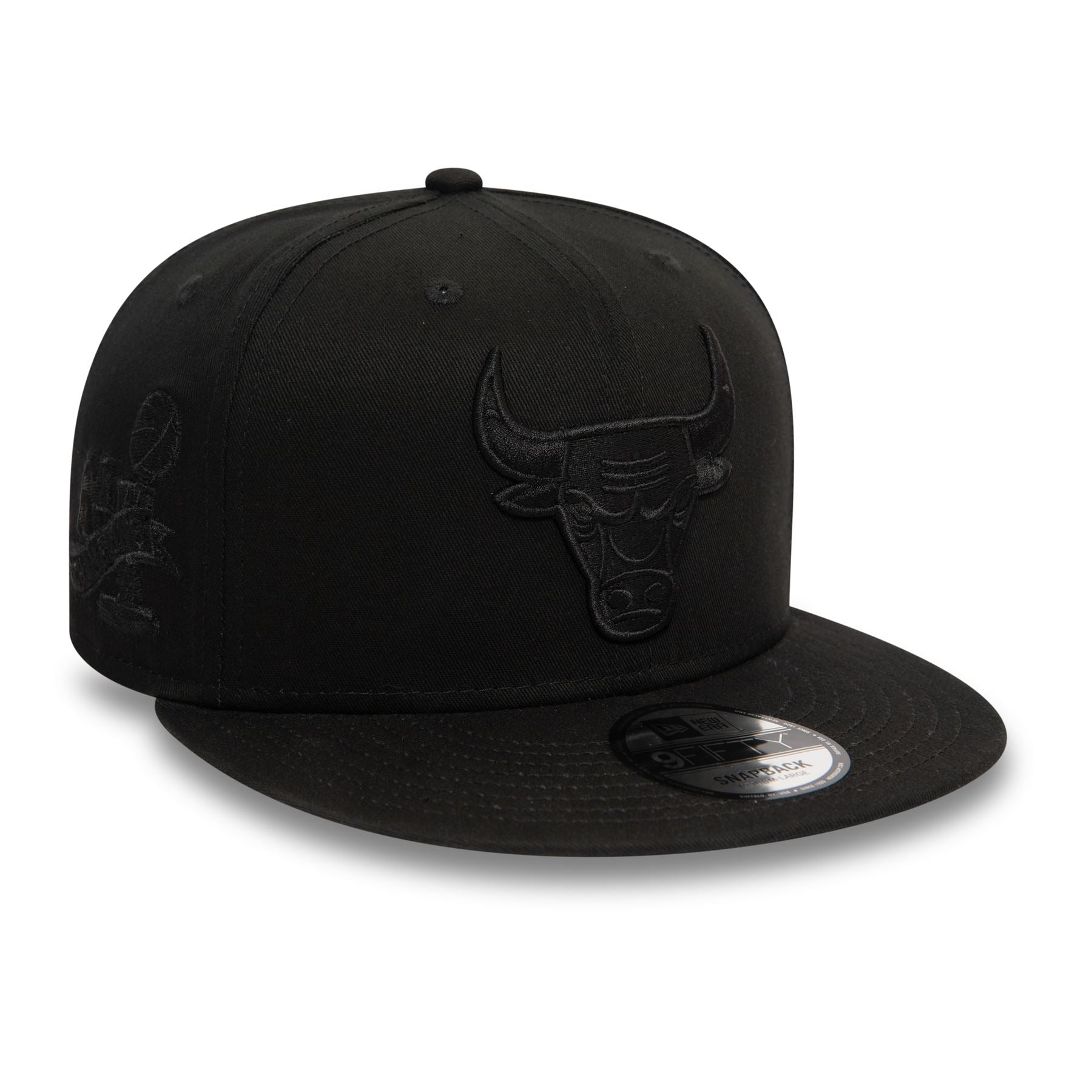 Official New Era Mens Monochrome 'Chicago Bulls' 9Fifty Cap. Embroidered 'Chicago Bulls' logo on front. Embroidered New Era flag on left. 6 panel structured crown. Flat visor with rear snapback fastener. Cap colour black with black undervisor.