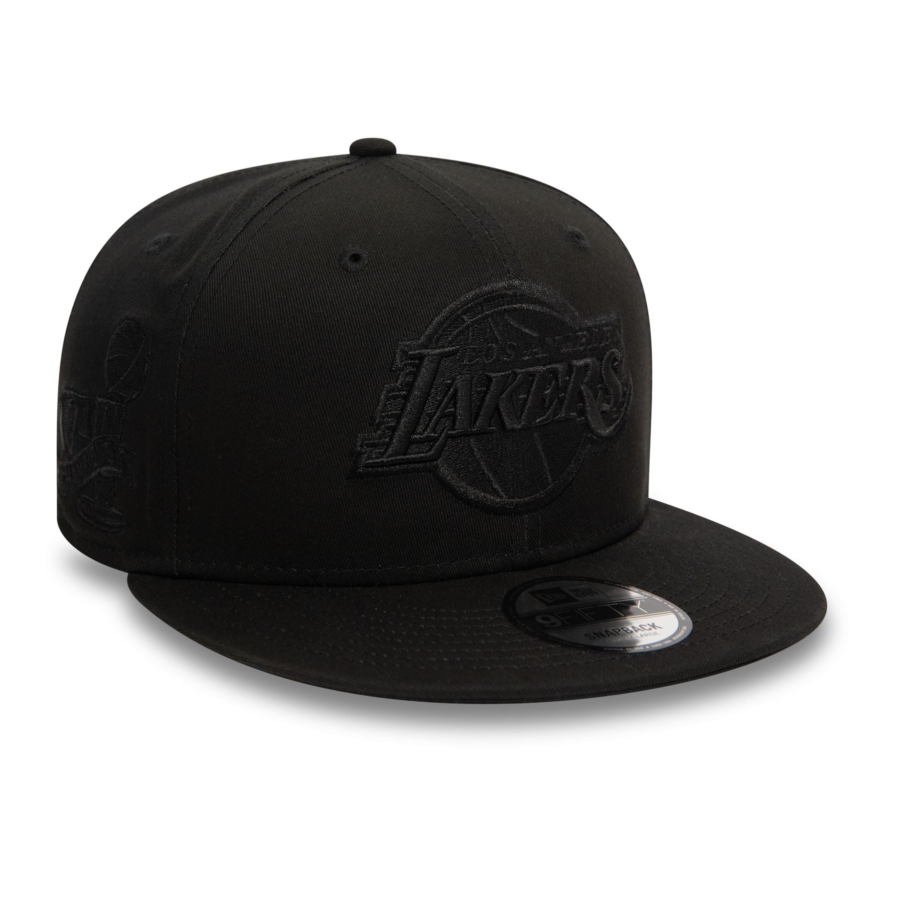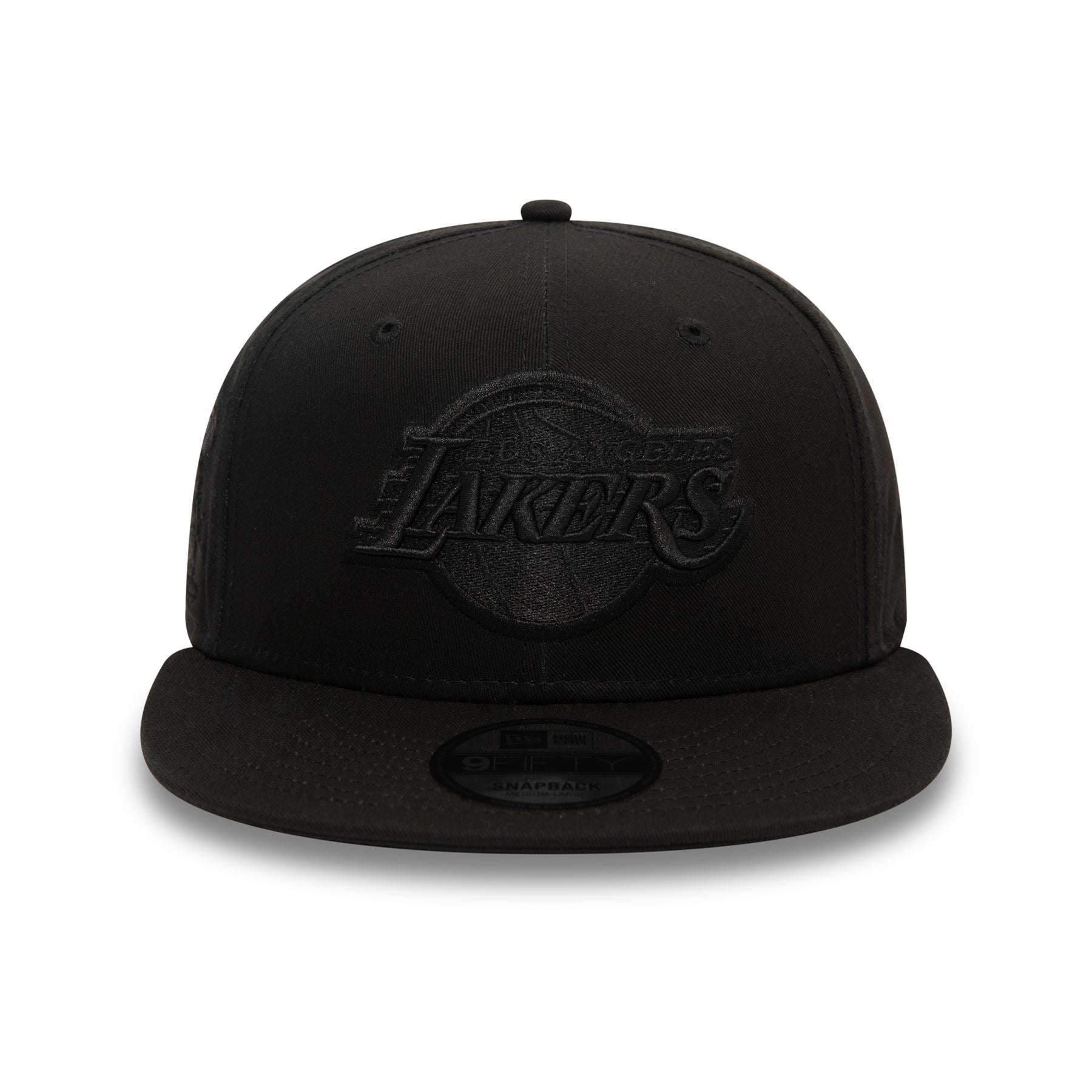 Official New Era Mens Monochrome 'LA Lakers' 9Fifty Cap. Embroidered 'LA Lakers' logo on front. Embroidered New Era flag on left. 6 panel structured crown. Flat visor with rear snapback fastener. Cap colour black with black undervisor.