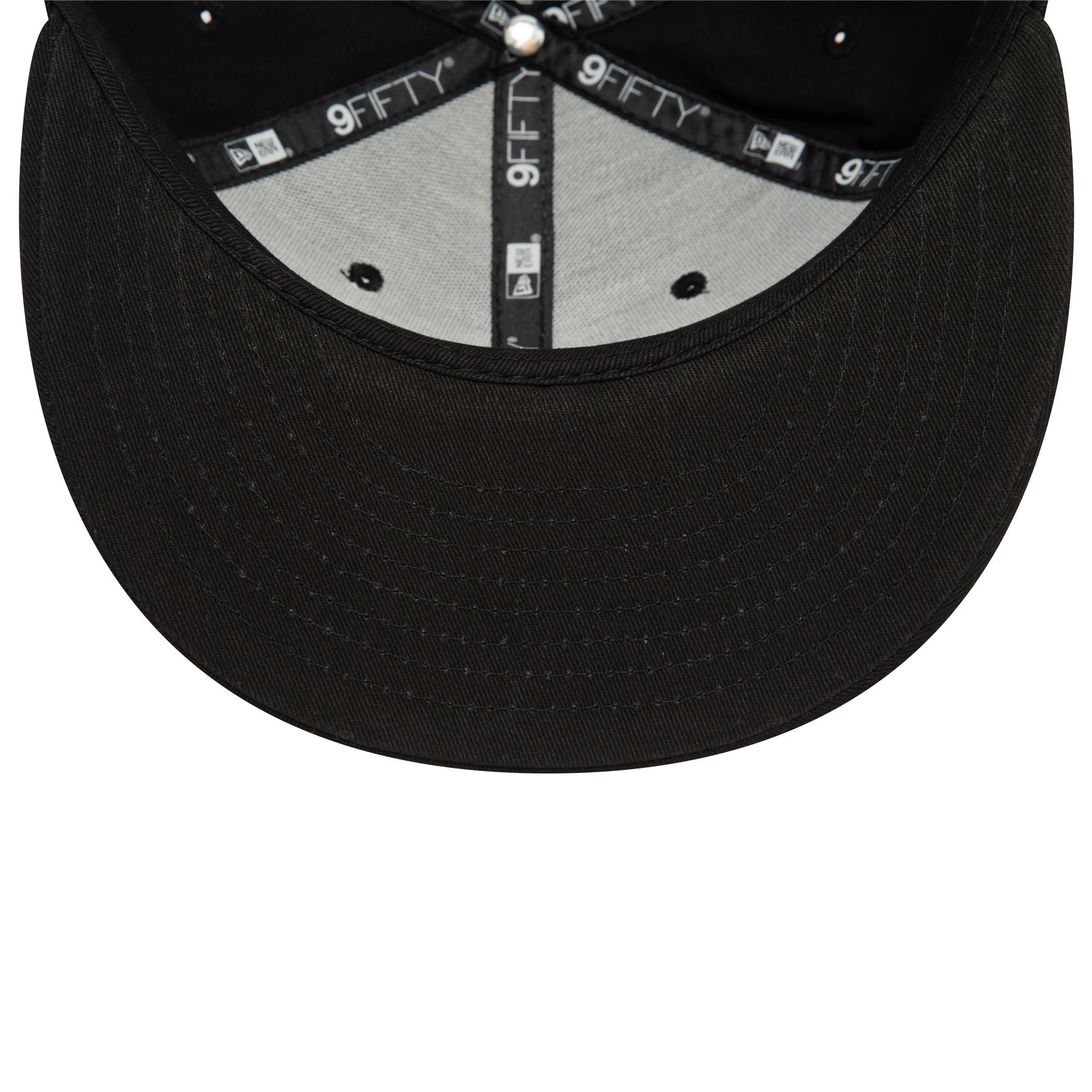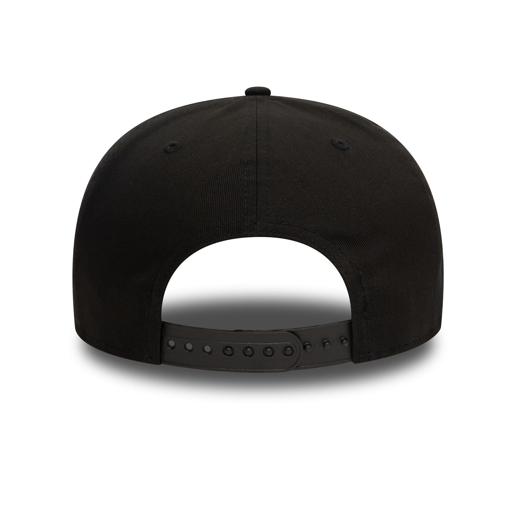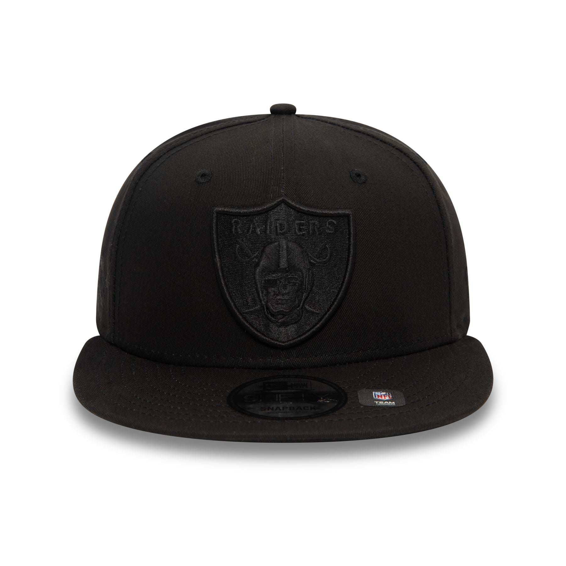 Official New Era Mens Monochrome 'Las Vegas Raiders' 9Fifty Cap. Embroidered 'Las Vegas Raider' logo on front. Embroidered New Era flag on left. 6 panel structured crown. Flat visor with rear snapback fastener. Cap colour black with black undervisor.