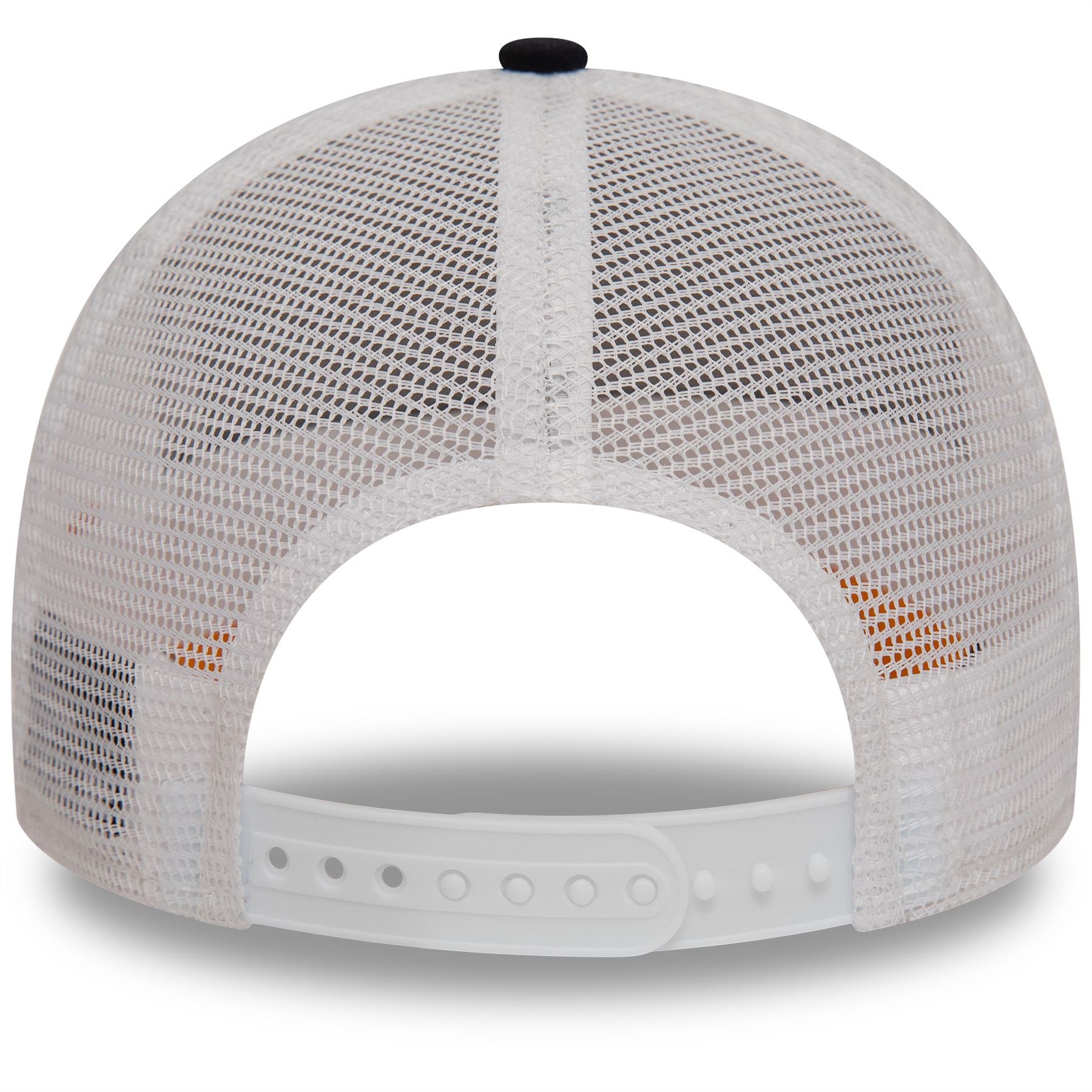 Repreve Red Bull Racing 9FORTY E-Frame Trucker Cap. Oracle Red Bull Racing logo on front. Embroidered New Era flag on left. 6 panel structured crown. Mesh back and sides. Curved visor with rear snapback fastener. Cap colour navy blue with orange undervisor.