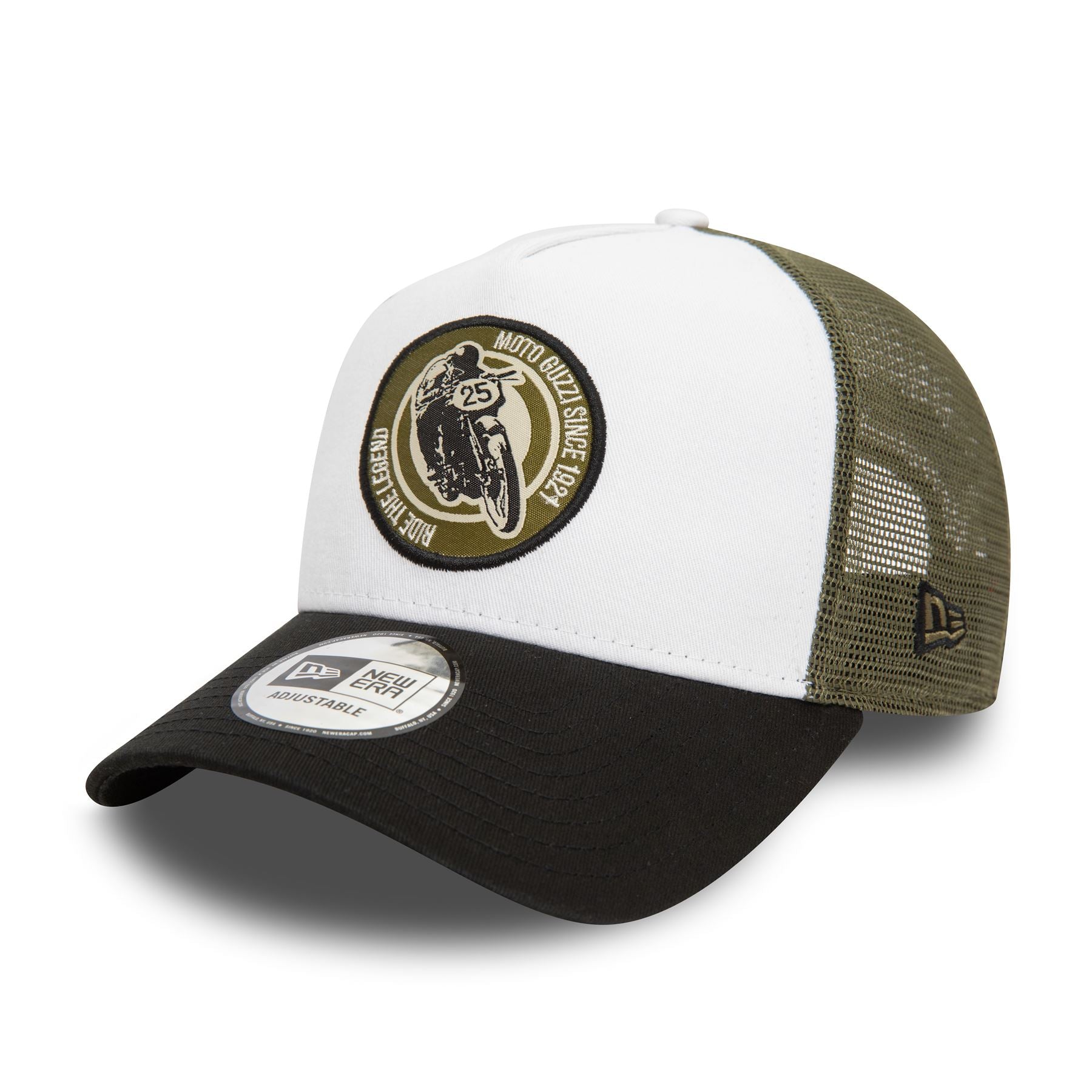 Official Moto Guzzi Ride The Legend A-Frame Trucker Cap. Moto Guzzi Ride The Legend graphic patch on front. Moto Guzzi wordmark on rear arch. Embroidered New Era flag on left. 6 panel structured A-Frame crown. Mesh sides and back. Curved visor with rear snapback fastener. Cap colour white with black undervisor.