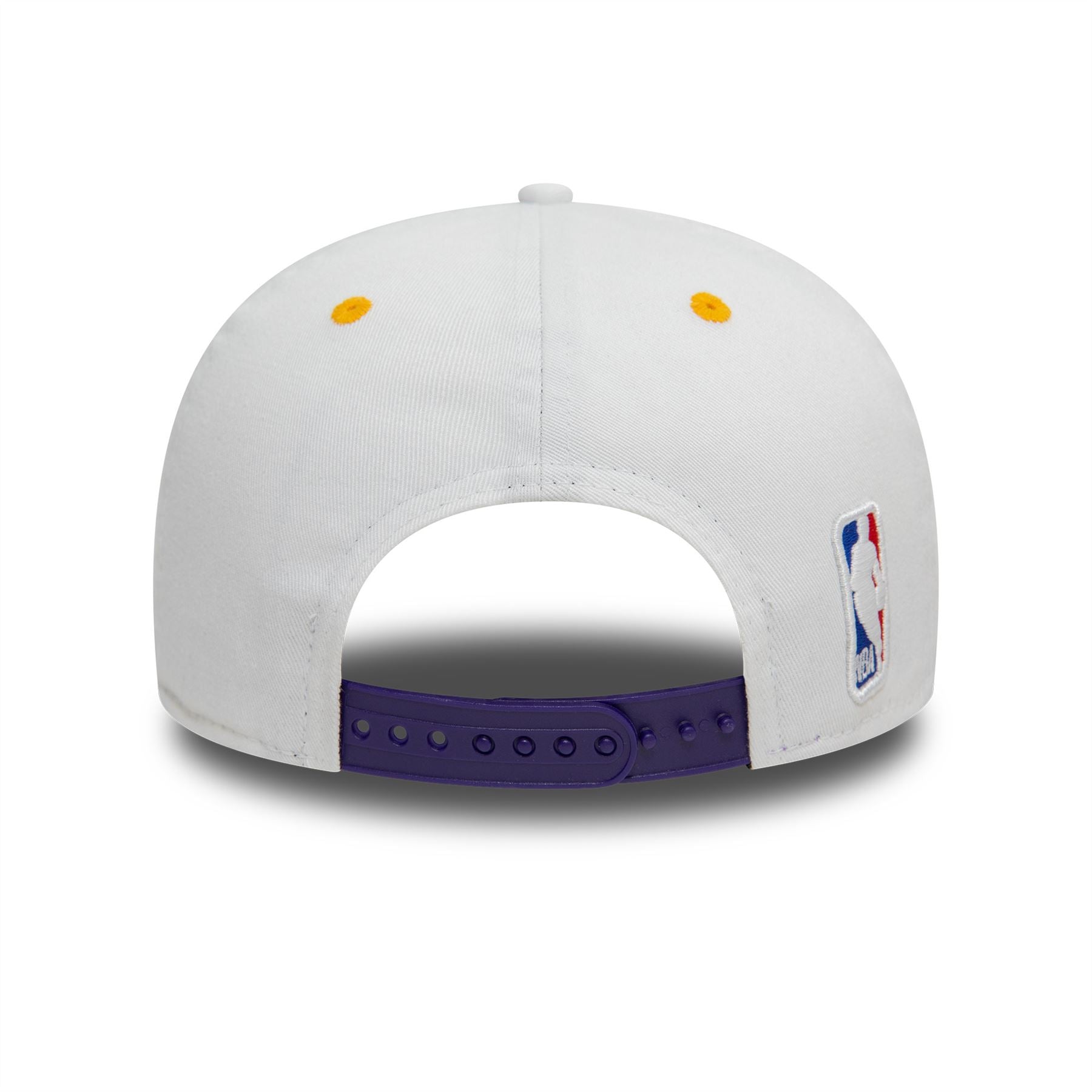 New Era Mens Washed NBA LA Lakers Golfer Cap. Embroidered LA Lakers logo on front. Embroidered NBA patch label on rear. Coloured braid across front of Cap. Yellow eyelets. Embroidered New Era flag on left. 6 panel structured crown. Curved visor with rear snapback fastener. Cap colour white with purple undervisor.