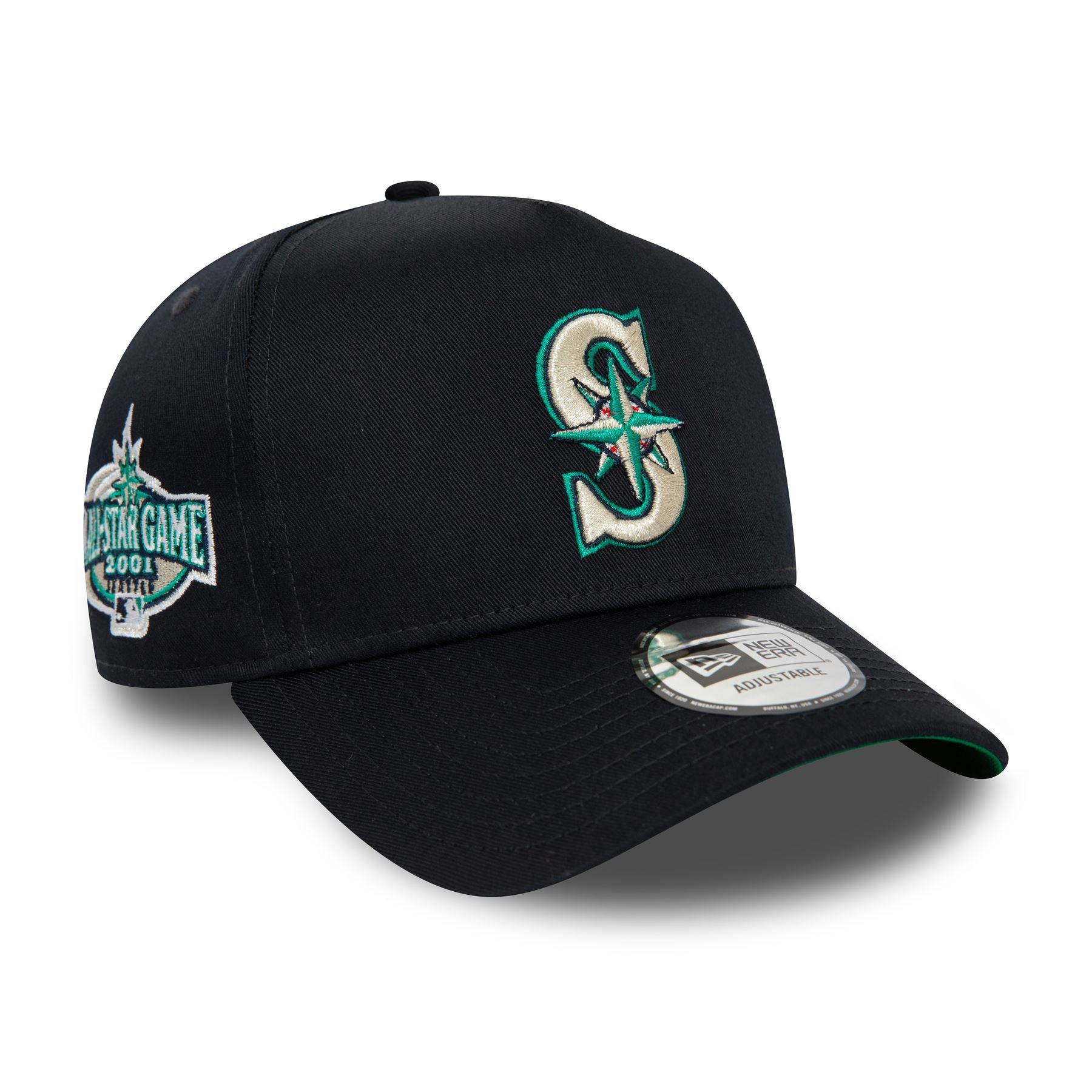 World Series Patch Seattle Mariners 9FORTY E-Frame Cap. Seattle Mariners logo on front. All Star Game 2001 sidepatch on right. Embroidered New Era flag on left. Snapback with a curved visor. Colour black with green undervisor.