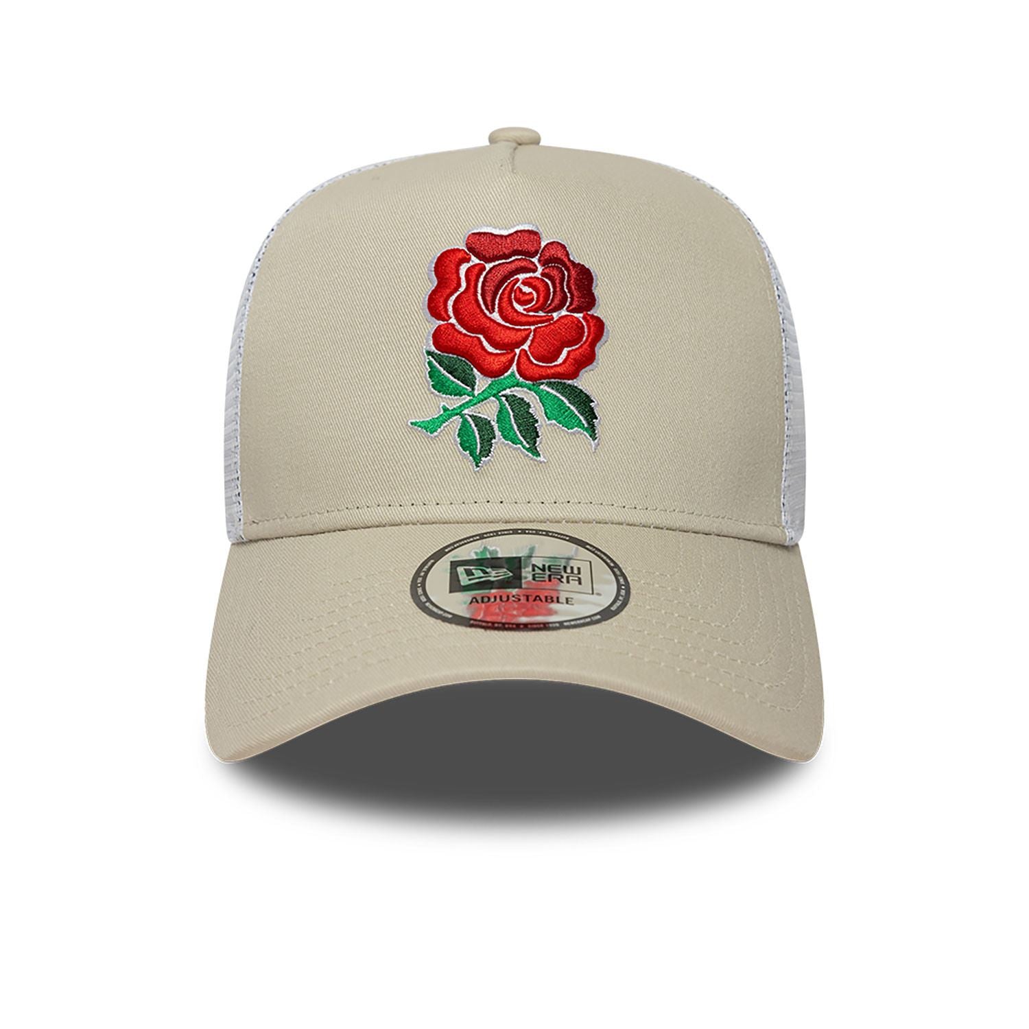 Official New Era Seasonal England RFU Mens Trucker Cap . Embroidered RFU logo on front. Embroidered New Era flag on left. 6 panel structured crown. Mesh panels side and back. Curved visor with rear snapback fastener. Cap colour light brown with light brown undervisor.