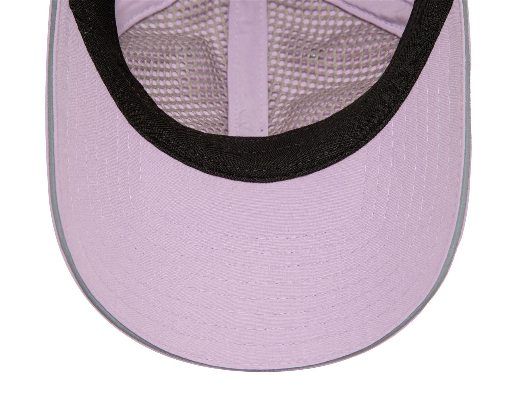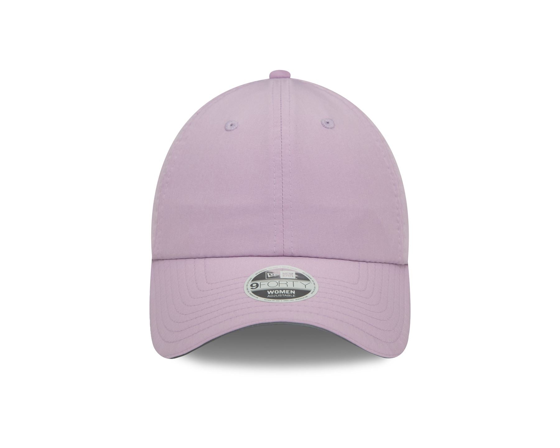 Womens New Era Open Back 9FORTY Cap. Reflective New Era Flag on left. Unstructured crown. Open back to accommodate long hair. Elasticated strapback. Curved sandwich visor with reflective middle. Reflective woven tab on rear. Webbed lining. Colour purple with purple undervisor