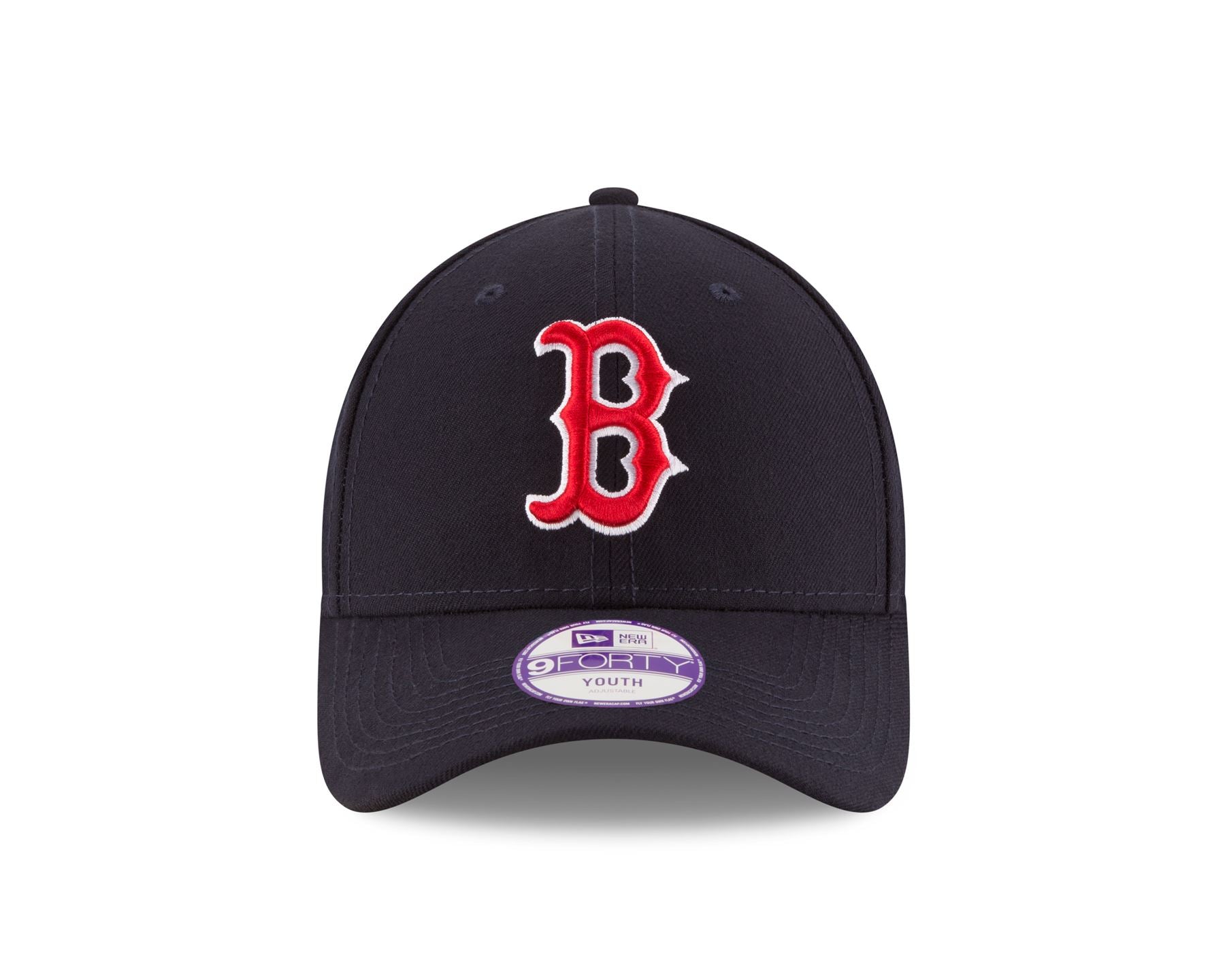 New Era Youth Boston Red Sox The League 9Forty Cap. Embroidered Boston Red Sox logo on front. Woven 'Red Sox' label on rear strap. Embroidered New Era flag on left. 6 panel structured crown. Curved visor with rear adjustable fastener. Cap colour navy blue with navy blue undervisor.