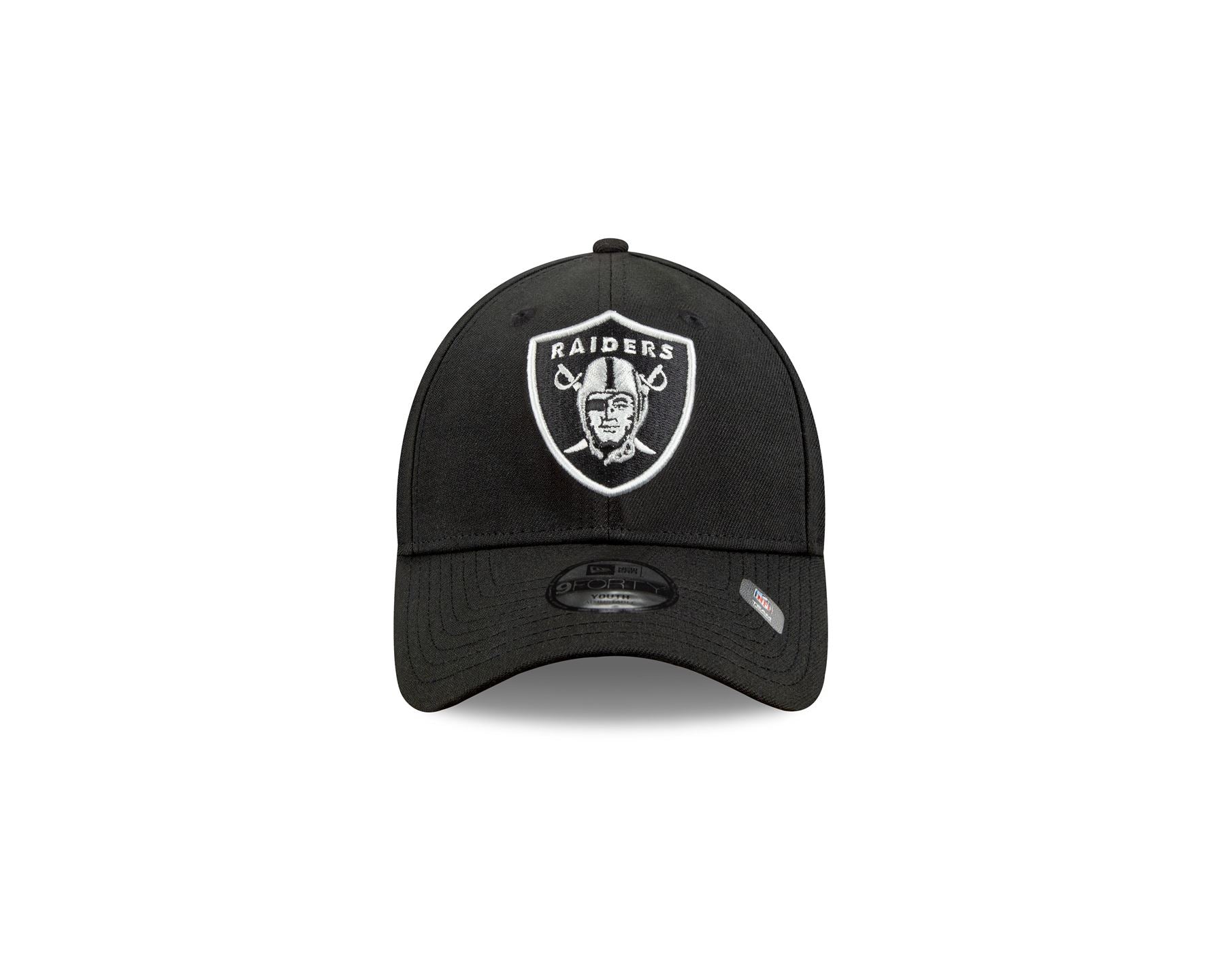 New Era Youth 'Las Vegas Raiders' The League 9Forty Cap. Embroidered 'Las Vegas Raiders' logo on front. Woven 'Raiders' label on rear strap. Embroidered New Era flag on left. 6 panel structured rounded crown. Curved visor with rear adjustable fastener. Cap colour black with black undervisor.